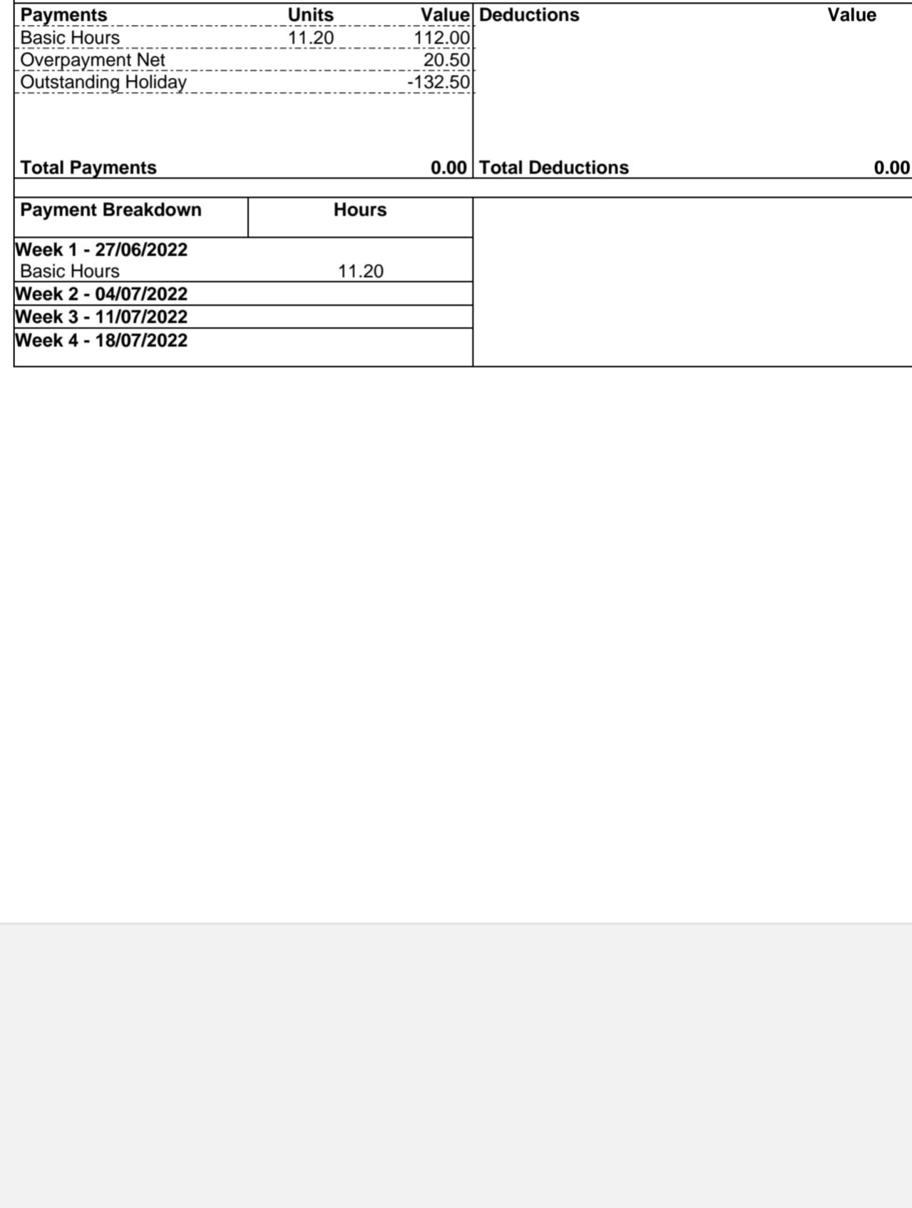 I left my previous employer at the end of June 22 and received my last full pay on the 1st of July, I signed up to universal credit on the 9th of July and so the universal credit statement ran from the 9th of July to the 8th of August. I was supposed to be paid a small amount of pay from my previous employer on the 29th of July but as I owed them holidays I received no pay at all. I received my universal credit statement on the 9th of August and it said I'm due to £0 on the next pay date as my employer reported I earned £752 from them in the universal credit assessment dates of 9th july-8th August. I haven't received a single penny from my old employer since my 1st of July payment. Staff at universal credit have ran a PAYE check and it says it was reported I was paid when I wasn't. Am I missing something here? I'm worried as I won't receive a full pay from my new employer until late September due to the way their pay cut offs work. My next pay at the end of August will only be around £220.Could that amount have been £752?The only thing I can think is that they have paid you £752 and then deducted it back as owed holidays, thus you've received zero but were actually paid £752.If that's the case, then what they have done is correct. Either way, it should show on your payslip. What pay does your payslip show for the period BEFORE deductions? Does it show £752 and then deductions for owed holiday taking it back again?