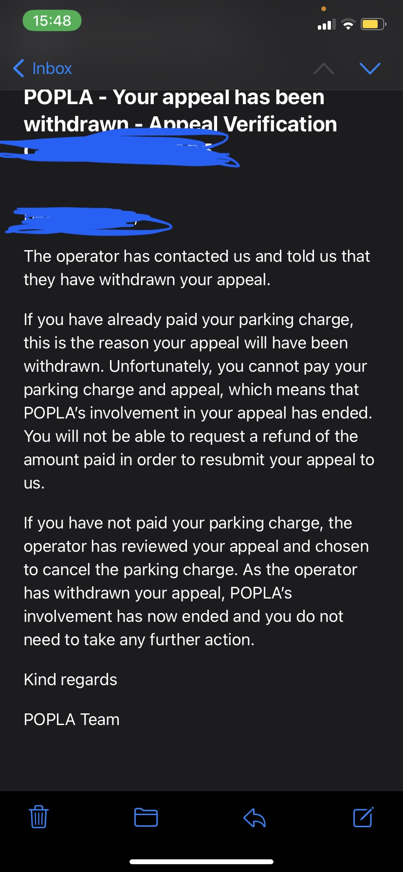I appealed to popla who have sent me this does this mean that the original person has cancelled the charge?