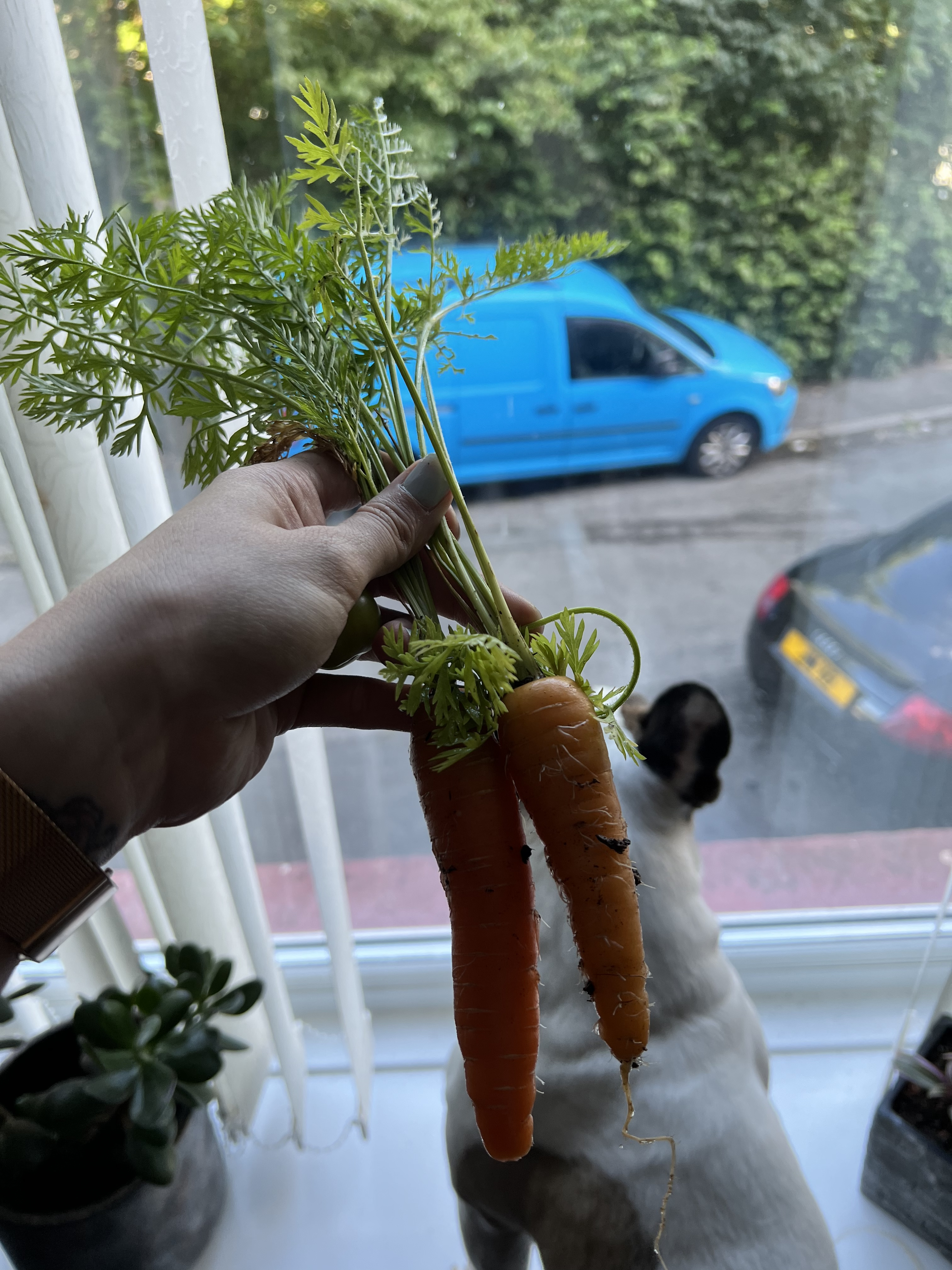 just been watering the plants whilst I wait for chicken dinner to cook, I plucked some “weeds” and out sprouted two carrots!! I forgot I planted them a while back, I also have some tomatoes on my tomato plant!