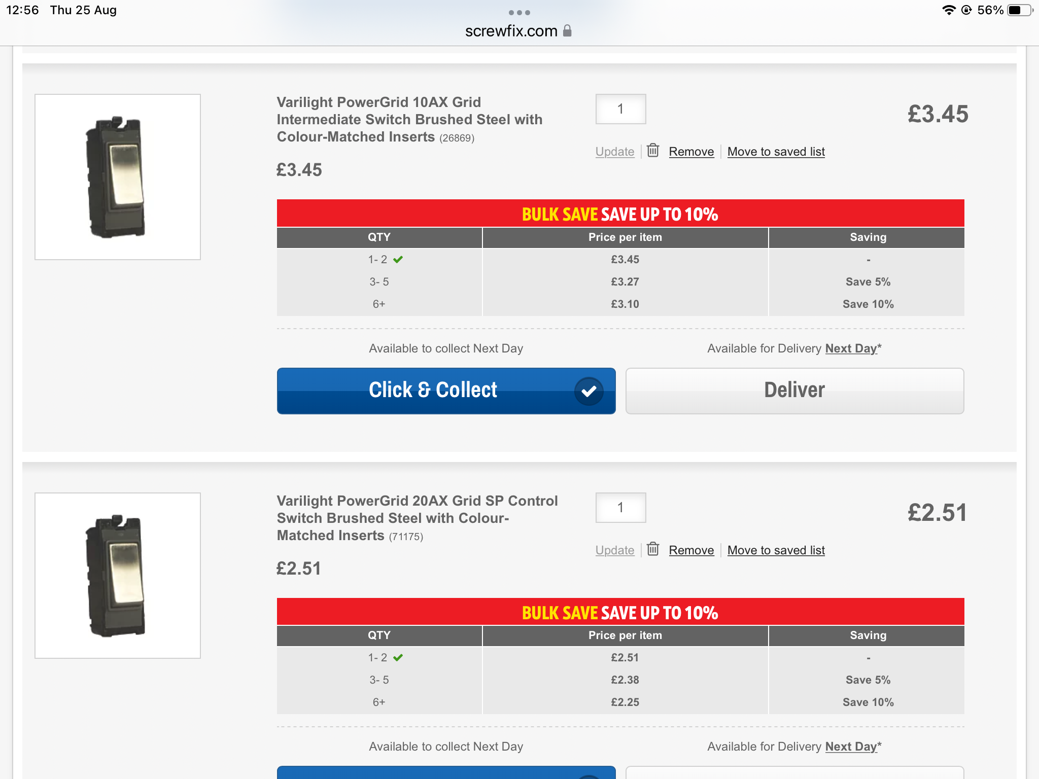 Erm, I’ve never wired a plug before in my life. My previous post was about changing a light bulb lol. But I do know where the power supply is and how to turn it off.Bendy_House said:Can you wire a plug? Can you swap a standard light switch without killing yourself? Ie, can you turn off the power supply, unscrew a screw, withdraw a wire, reinsert a wire, and tighten a terminal screw?Phew - thank t'lawd.If you post a pic of your existing switch, and also a link to the one you were hoping to buy, we 'should' be able to advise on how to swap the wires.The secret is to either label them and take photos before swapping, or to move them one at a time. Or both.I had to do a 4-ganger recently, with a mix of one and two ways. The new switch had the terminals in the reverse position, so the common links would barely reach. Made my head spin. I had to draw them all out before starting, and even then it was sweaty time.2-gang should be ok.So I think I will buy the switch online and when I have them, come back here with photos for a step by step guide. Thanks for all your input- that's a twin plate rocker switch- that's a dimmer from Screwfix.Check the look of yours at the back, but most sellers don't show the back view, so, you can't be 100% sure.'Com' terminals in the first picture and middle terminals (~) in the second one have to be connected together.BTW, 'grid' switches are basically the same.0 -