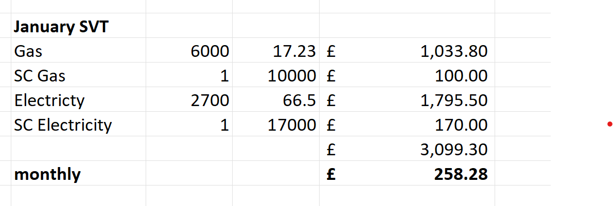 For electricity it's 20.41p per KWh day and 8.52p per KWh night, gas is 2.7p per KWh. I Normally use about 2700 KWh a year for electricity and about 6000 KWh a year for gas.