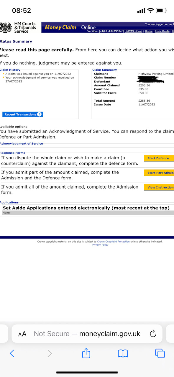 My partner received a parking notification from the county court, with the issue date being the 11/07/2022, we filed an AOS 27/07/2022.