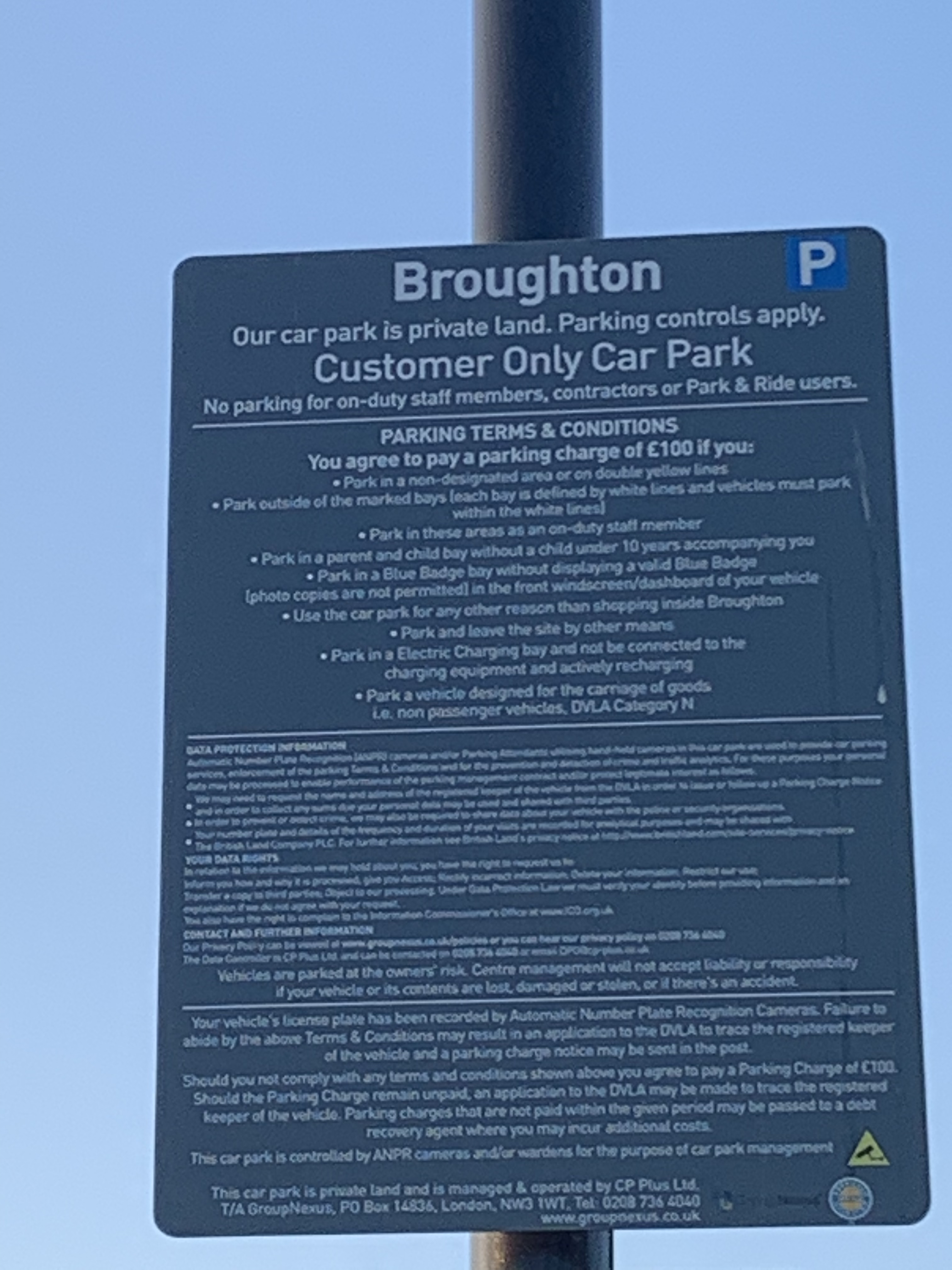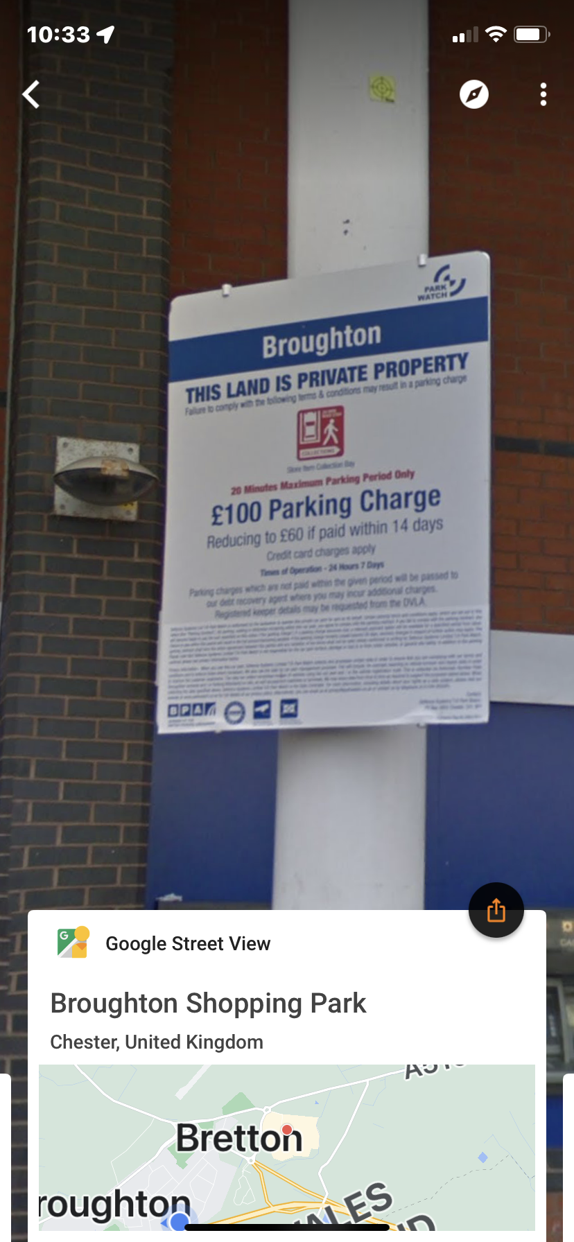 Cazzy1964 said:Umkomaas said:What was the name of the car park/location as we could well have already had previous cases about it? ParkWatch have a number of sites with 'forbidding' signs which means they may have difficulty in arguing that any kind of contract was formed.I’ve managed to find the sign that was up on Google street view but can’t read the small print.While you're there, check for any totem pole signs (usually near the entrance) as that often shows the retail park's Managing Agent who might help if a complaint is made.Please note, we are not a legal advice forum. I personally don't get involved in critiquing court case Defences/Witness Statements, so unable to help on that front. Please don't ask. .