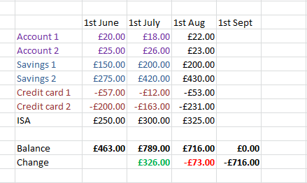 In the beginning I got myself into lots of debt on my spreadsheet when I still actually had money in my accounts. I did try to use a Google sheets template that I found online and initially it went well but then I got into similar troubles with it.RG2015 said:My spreadsheet shows payments to my own accounts as transfers so my balance remains positive.