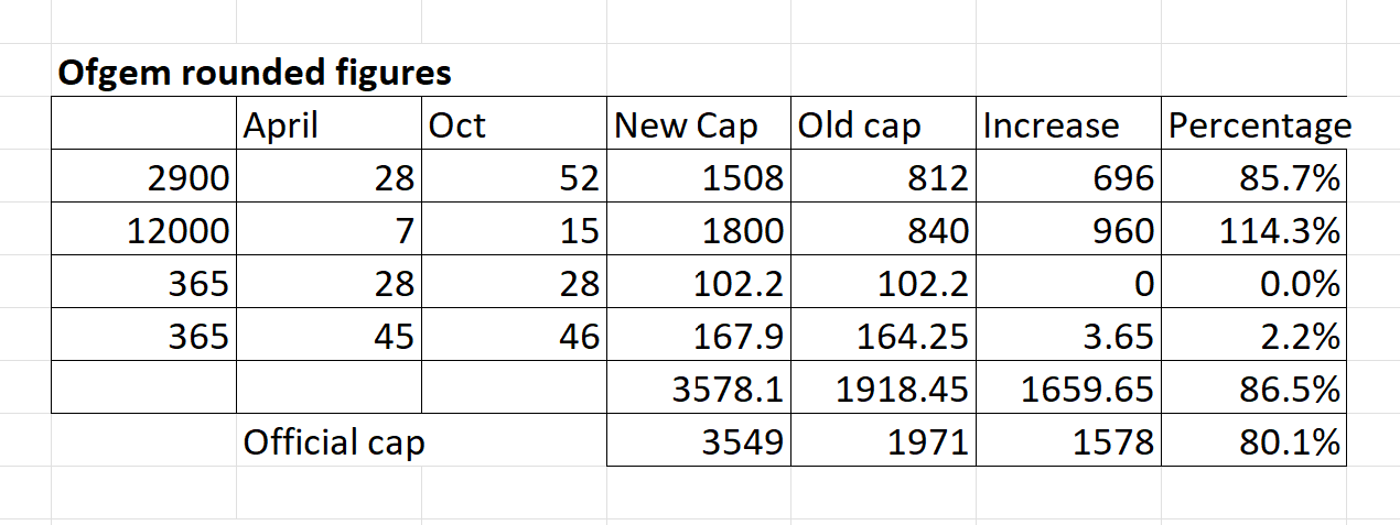 For your electricity example (rough numbers) it would change from 1520/820 (85% increase) down to 1640/940 (75% increase).I'd love to see your calculations for that because if I include the standing charge, which is basically 1p on gas/electric, that's £8.25 per year more, so the total ends up £3333 instead of £3325, so it's still 100%.I don't know where you get your figures from.1 -
