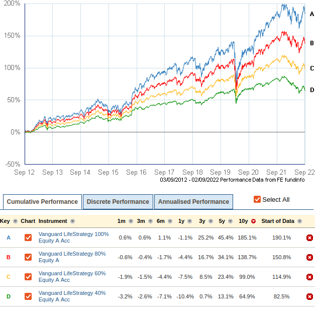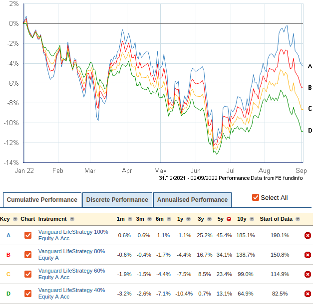 Collyflower1 said:Looking at VLS60 compared to LS100 the former is -5% since i opened it at the end of january whereas LS100 is c. +1%! I'm wondering what the point is! Just in the event that i'll lose less in the event of a crash?LS100 should be expected to outperform LS60 most of the time over the long term, and more often than not over the short term. The reason someone might choose LS60 is that it is more of a steady ride. Steady doesn't necessarily mean you'll lose less, though often LS100 will fall further. This happens to be an example where LS60 fell further.