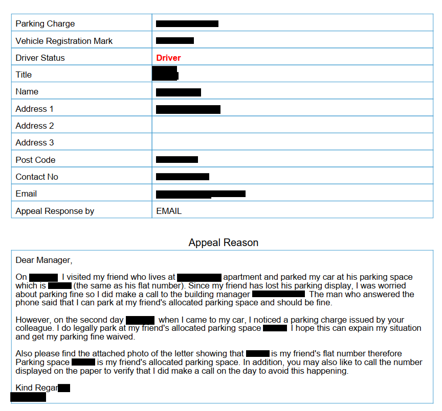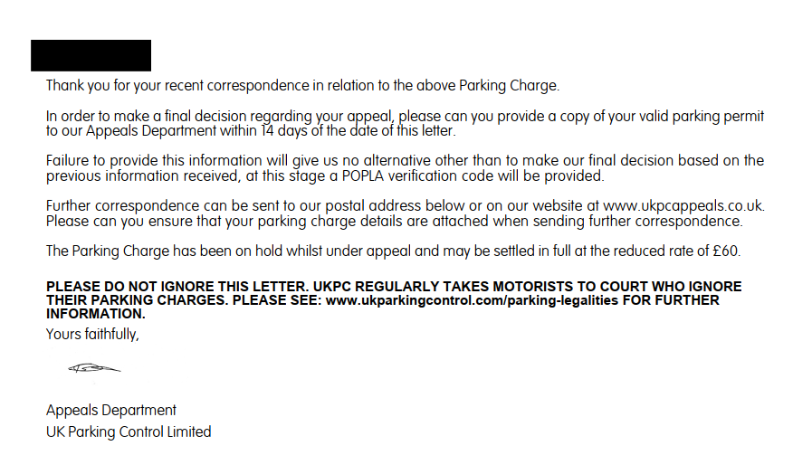 Basically I parked my vehicle at my friend's rental place and parked at his allocated car park. He has lost his permit therefore I phoned up the building management who instructed me to parking at the allocated parking space. However the second day I received a PCN from UKPC. Quite unfortunately I was a bit naïve and have appealed the situation and all was recorded in the correspondence as below: