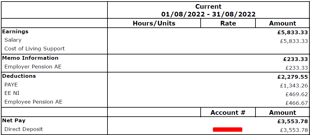 Thanks for clarifying.molerat said:You are being taxed on the total gross pay - tax on £5833.33 at 1084L is £1343 - so your pension is relief at source, 25% will be added by the provider. Is your tax code suffixed with X or M1 as the tax deducted does not seem quite right for a cumulative code if you have had exactly the same gross pay each month.