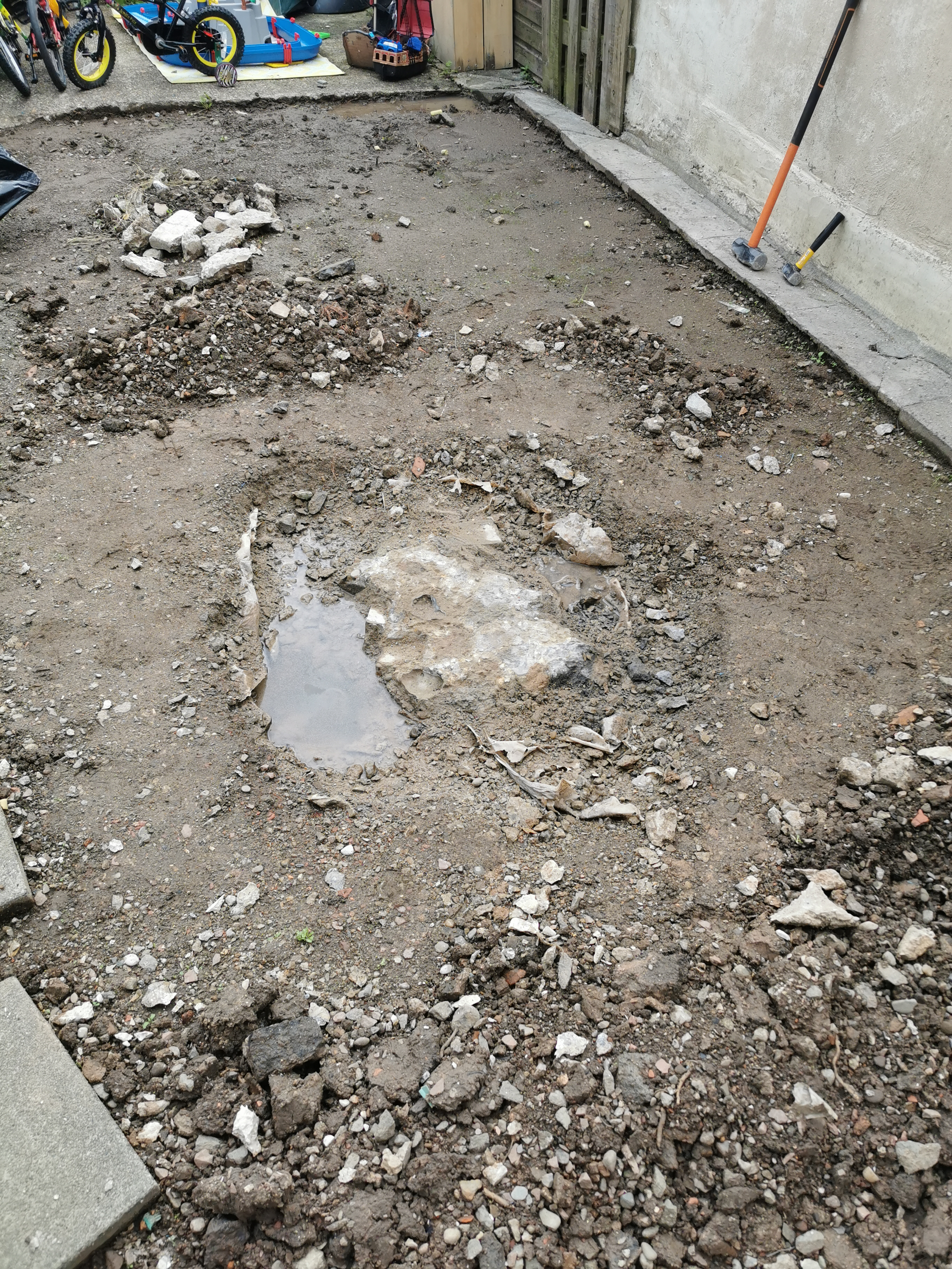 I would nibble a bit more off the top, tidy around it with soil and rubble and just leave it there under whatever you plan to put in place of the paving.