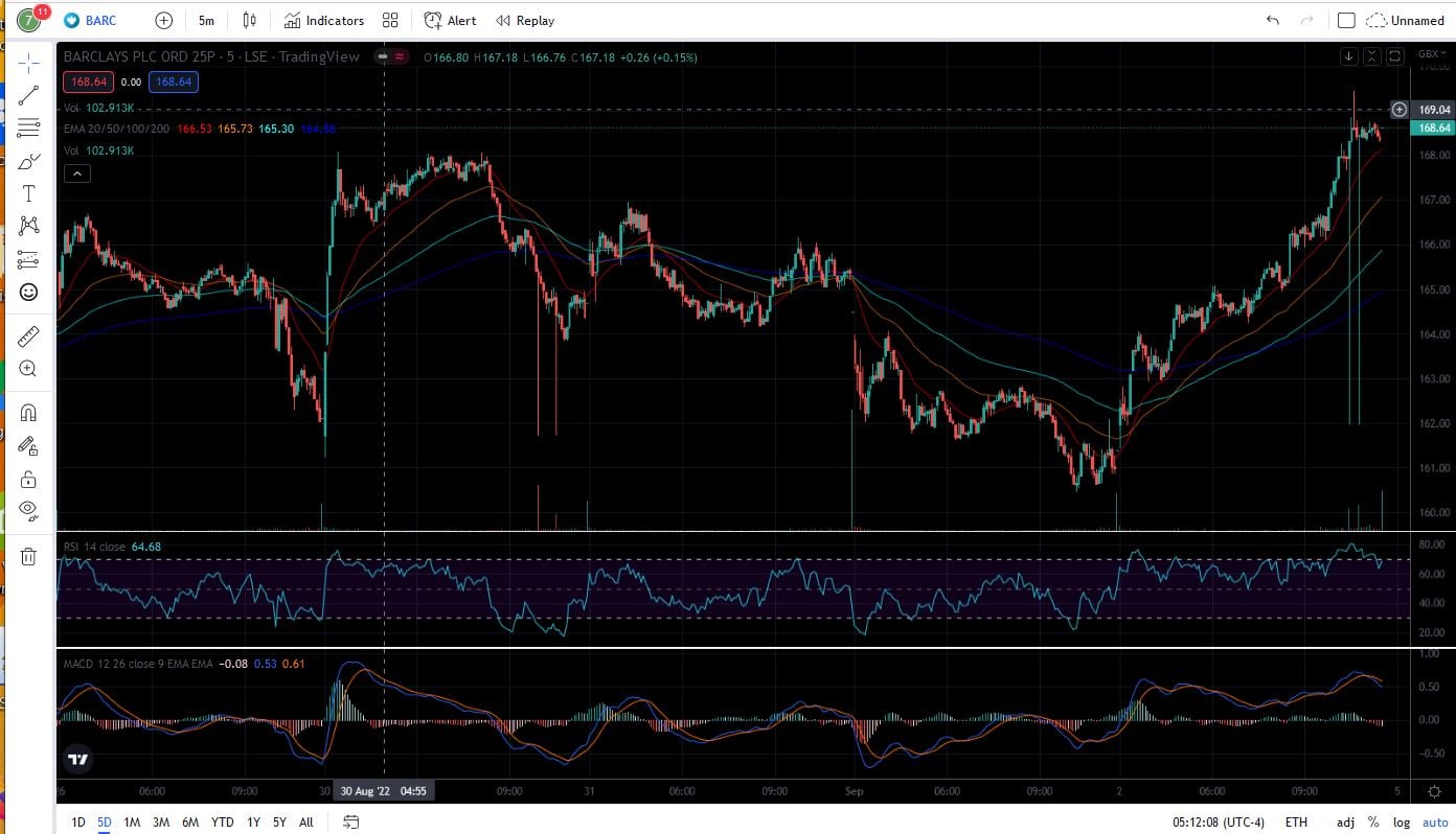 Brie said:I know Barclays does sharepurchase at the beginning of each month (don't ask me how I know.....) so possibly that may be it?? 60k employees possibly buying £50 each (to max their share matching over the year) would be 3.6M shares at one time.Indeed there is significant volume movement September 1 and 2 which is reflected in the price. This is 5-days and 1 day range in the chart.