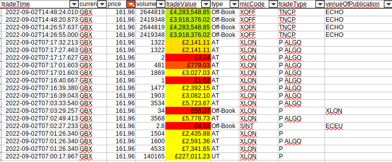 If you download the data from LSE, you'll see there was actually a total of £16.4m traded off-book and off-exchange at the 161.96 price, all reported between 15:26-15:48 BST. Note the exact same pattern of volume and value in the two pairs of trades reported. No other trades in the 161.9-162.1 range were made after 08:20 BST. Perhaps not a coincidence that the market opened at 161.96.