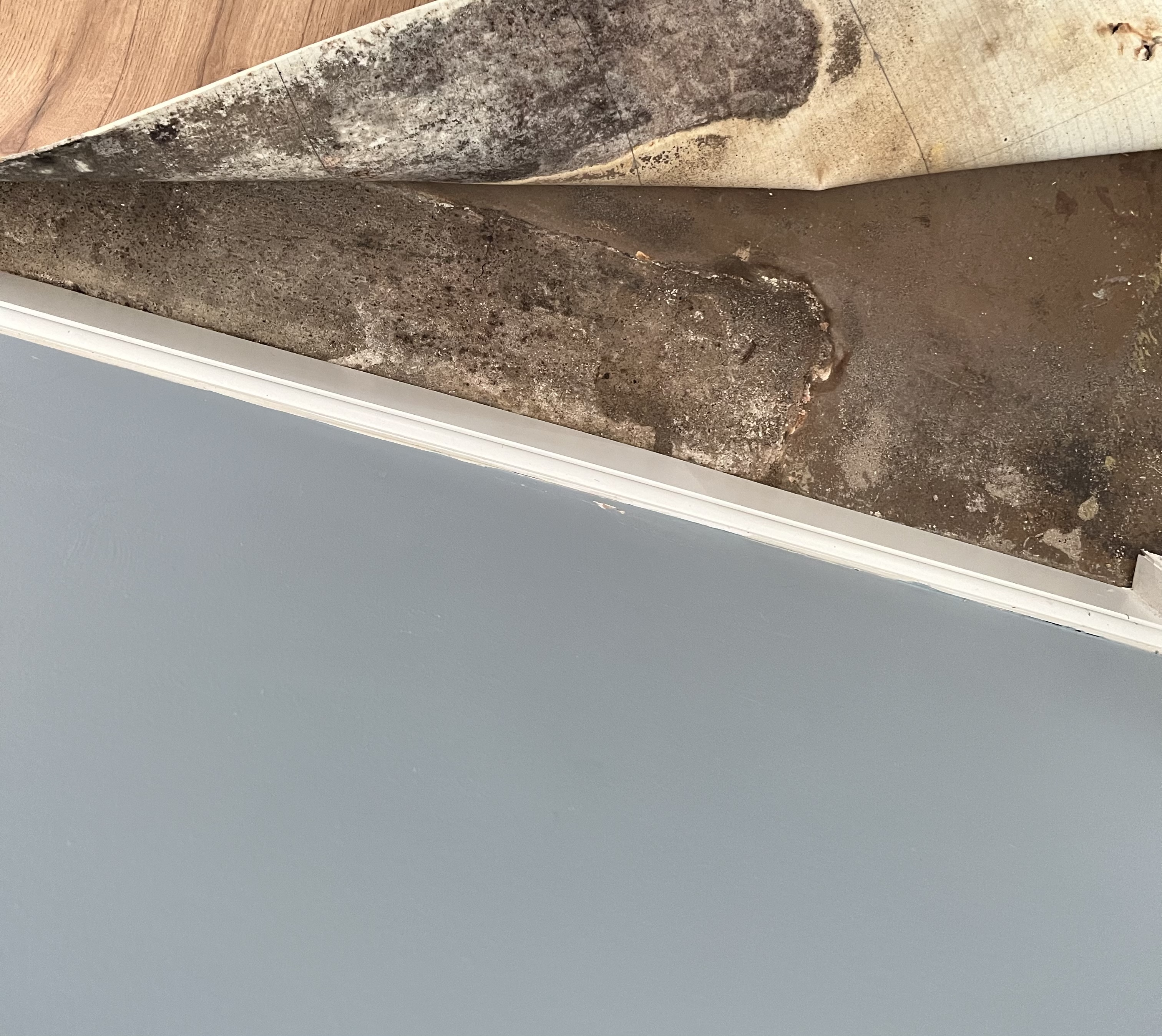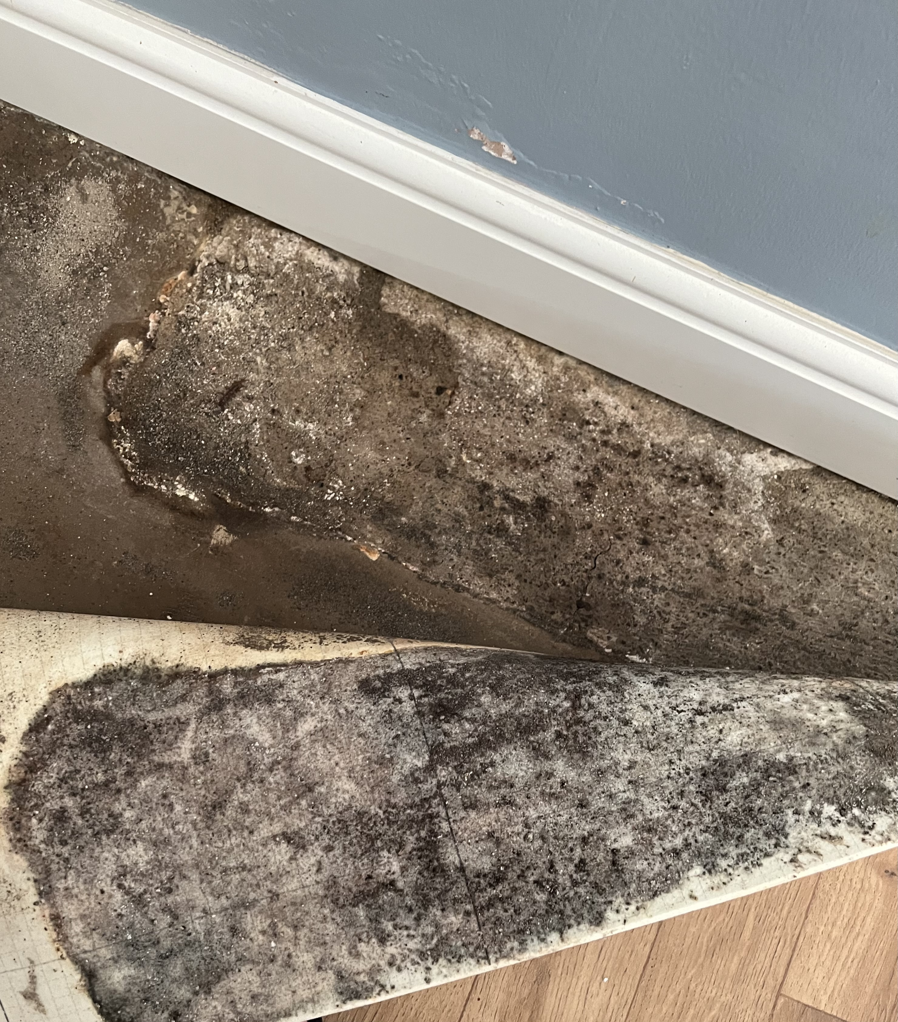 It just looks so much like a small water leak below the floor.I just hope whatever it is, it’s behind the skirting board and it’s easy to access!!