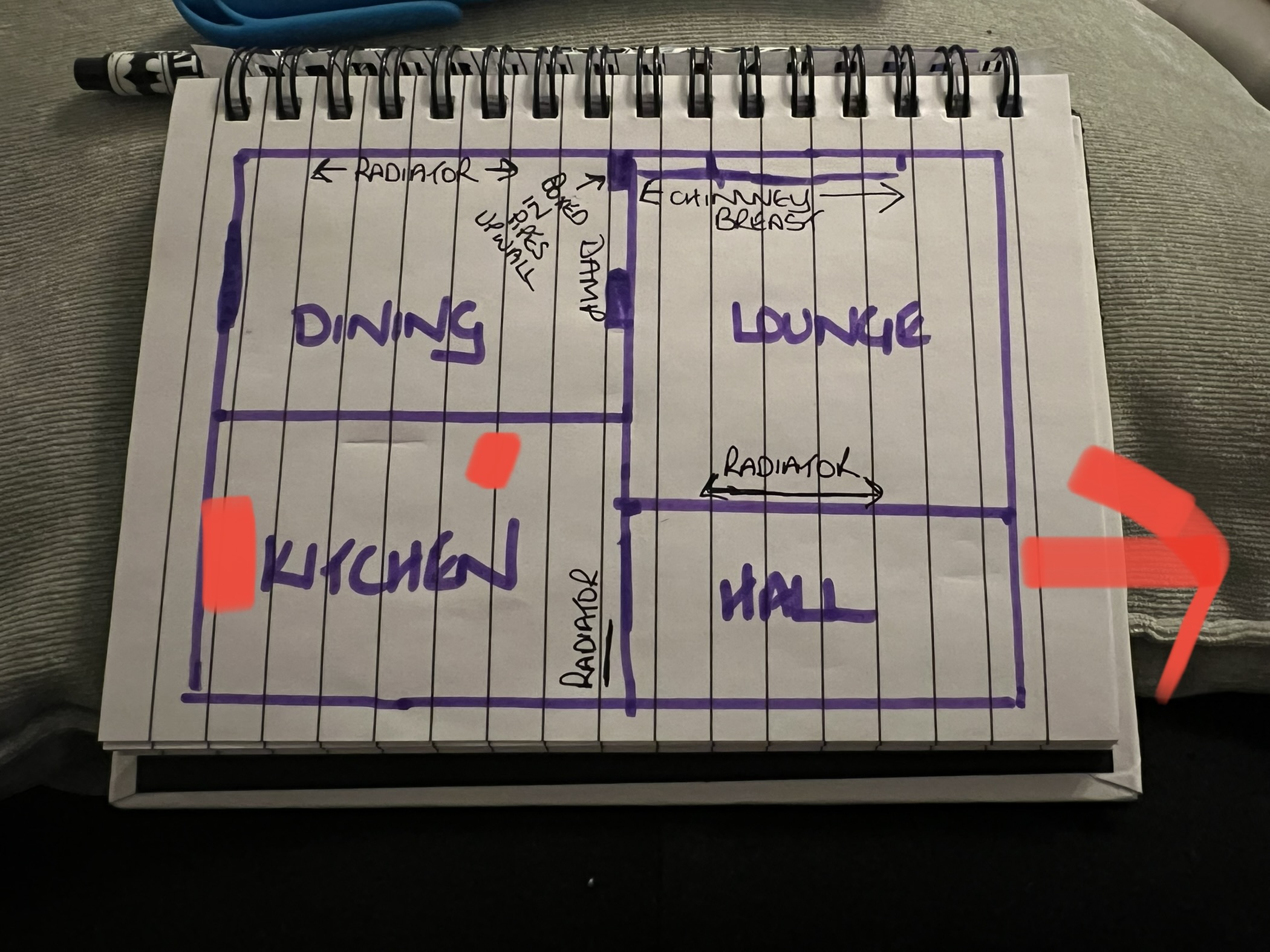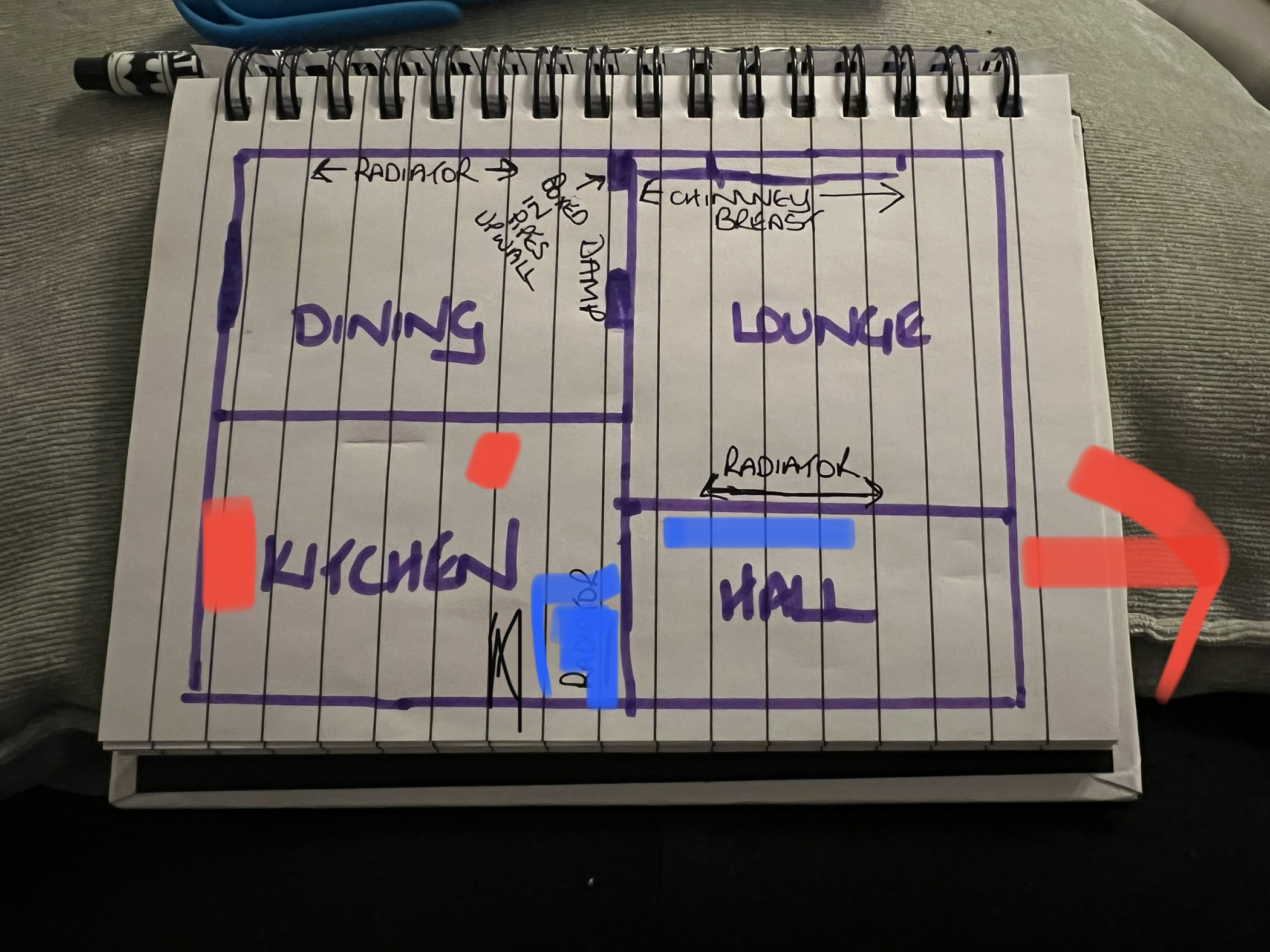 (I had that happen with some peeling paint just above the skirting board and also the skirting board started to separate away from the wall, too. And there was also a thin vertical crack in the plaster. My boiler pressure was not dropping... but I suddenly got the annual water bill and nearly died of shock!)I’ll certainly keep it in mind though. I don’t know if it’s relevant but would the mains pipe be in that direction or is it not that simple to tell? I’ve added to the earlier picture. The arrow points to where our water meter is outside on the pavement in front of our garden. There’s also a manhole cover in the front garden in the path of that arrow if that makes sense?The red line next to the K for kitchen is the sink with dishwasher next to it and the small red spot is where the stop ‘clock’ is.