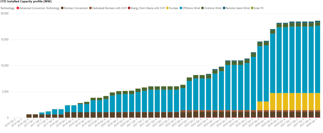 And here is the cumulative chart of all CfD projects - you can see the new nuclear station coming in yellow on the right hand side. Looks to me like about 4GW of wind capacity with these contracts at the moment, most of which is offshore (and therefore newer). Based on DUKES (the official statistics) there is about 12 GW of wind capacity in the system - so about 1/3 of it is on CfD.0 -
