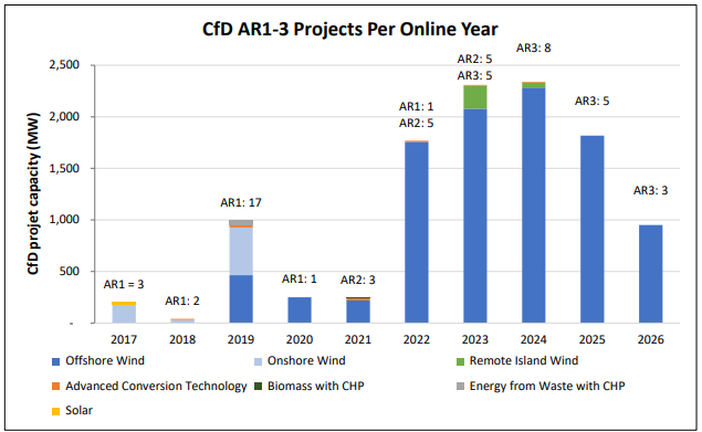 You might find this interesting then - it's the projects in the three allocation round auctions for CfD contracts by planned year of first output (2021 data).