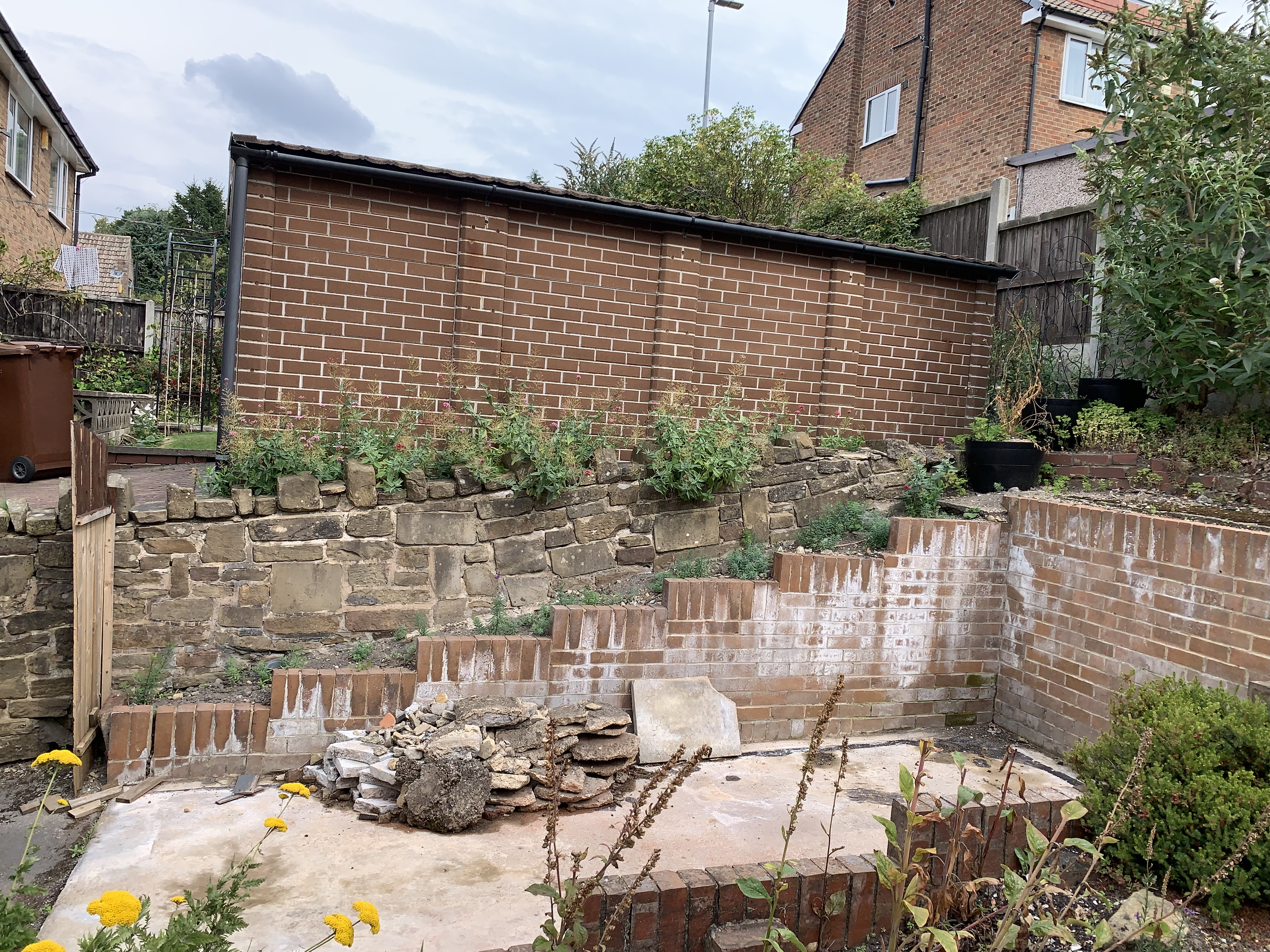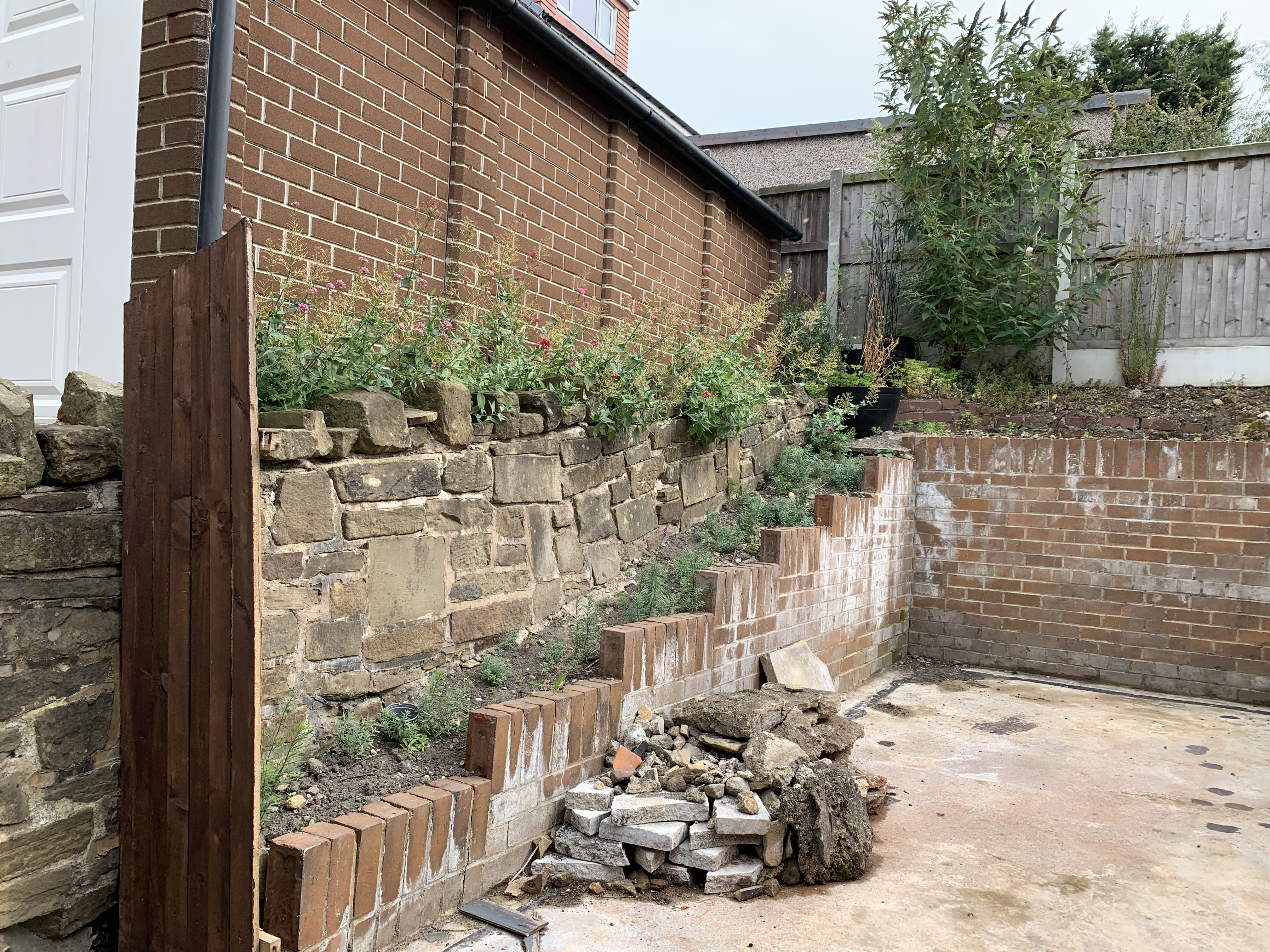 This shows the state of it before I did the weeding last week. Those weeds are growing out of the wall, not in soil behind it.I think I am beginning to understand why the previous owners had poured concrete over that soil area. We removed it (that’s what the pile of rubble is) as we didn’t know what was underneath and it wasn’t stable/safe to walk on. We thought it would be straightforward to dig down to level it for gravel boards and fence panels but it isn’t ‘just soil’.2 -