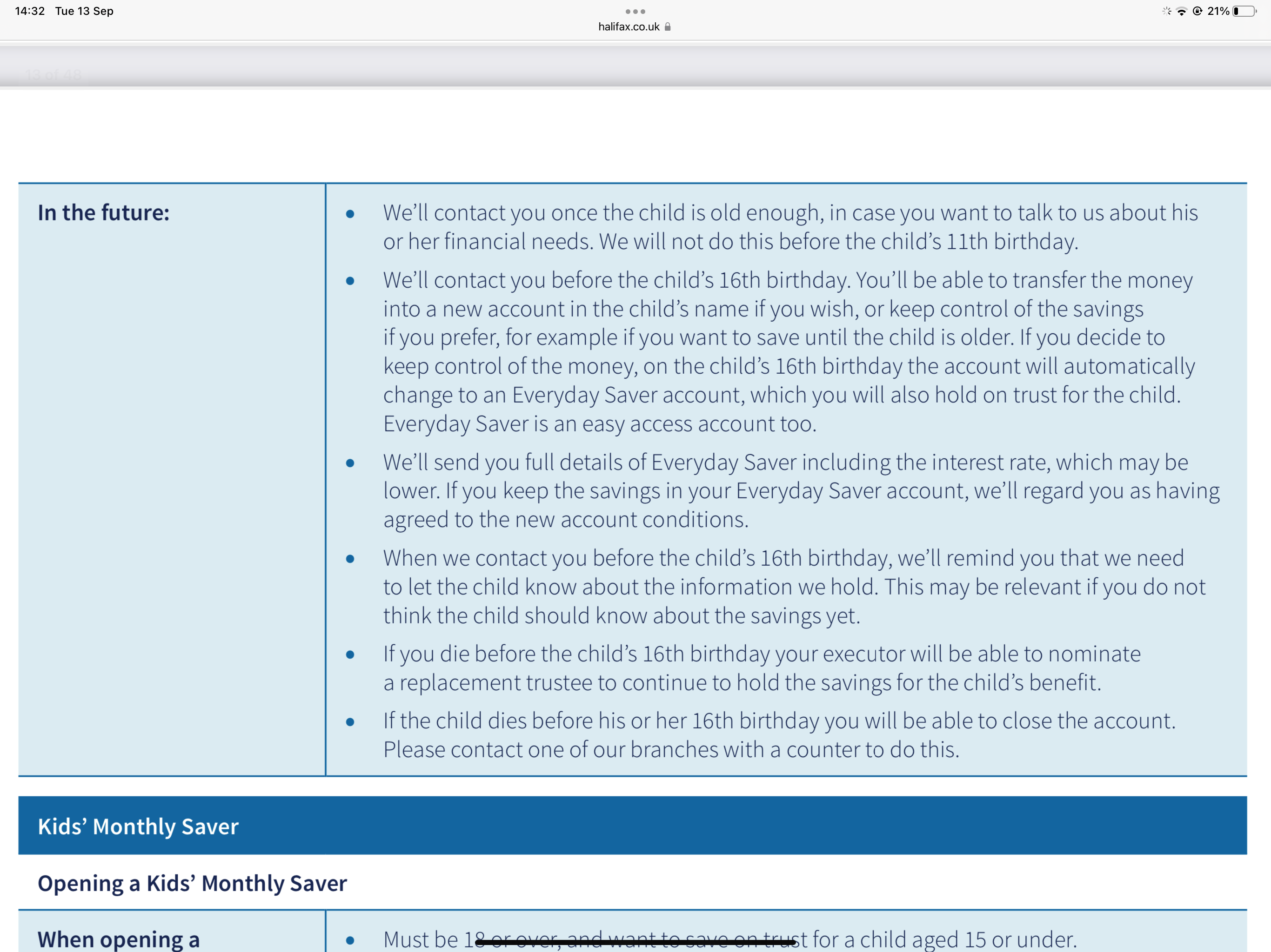It shouldn't have closed but rather become an Everyday Saver which would continue as a bare trust. I'm guessing you actually closed it yourself?LeadFarmer said:Looking to move my sons bank account now he has reached 16yrs, his Halifax child saver account has now closed due to his age.