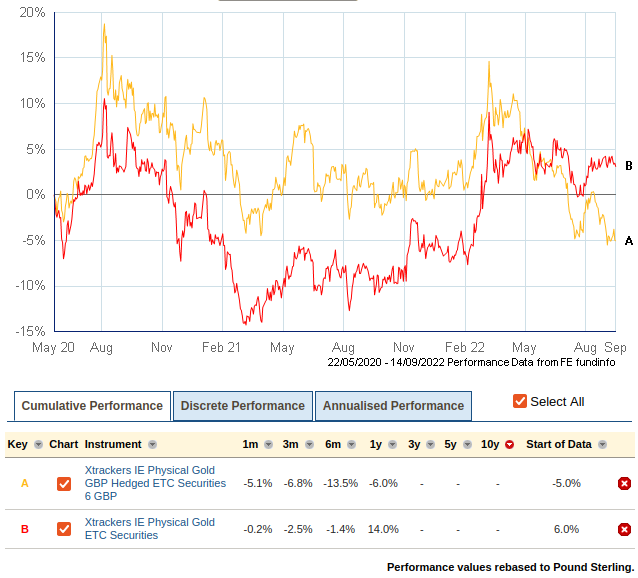 Altior said:Hedged gold means that you're negating the currency gamble, it's a pure gold play. Which is the idea of buying and holding gold, I'd have thought.The table presented is just gold's performance in the chosen currency. There are popular ETFs that trade in GBP vs USD, but they are not hedged, and are physically backed by the yellow stuff. They deliver exactly the same performance, but the USD version will involve forex when you buy and sell it.A GBP-hedged gold fund would have fallen in value during 2022.