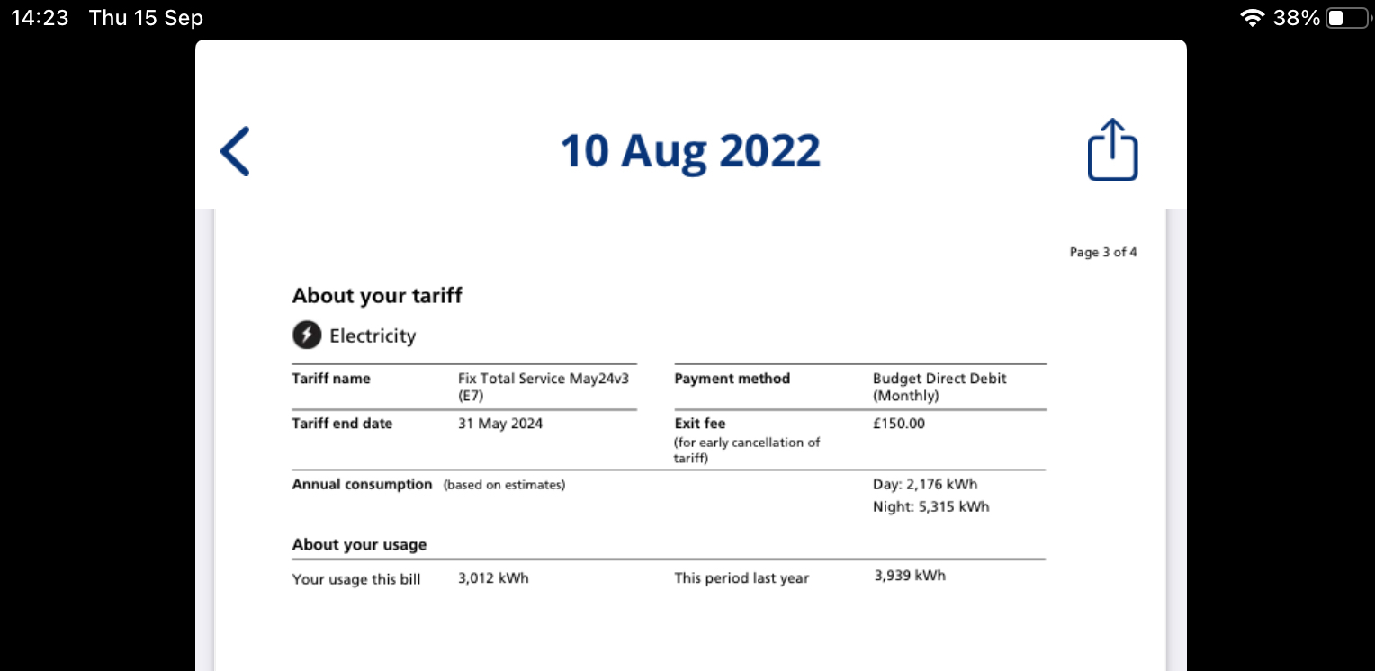 Hi thanks for your reply. Yes figures at the top are the SVR for E7 for our region (north wales) I have the option to change to this now. We have an exit fee of £150 but on live chat last week edf said they wouldn’t charge the exit fee. My last bill is below (we are billed 6 monthly (pay DD monthly)[Deleted User] said:Hi - it's a nightmare, isn't it?Just to clarify - are the figures at the top of the screenshot the SVR for E7 for your region and are they giving you the option to change to that? Have they said anything about exit charges?Assuming that is the case, whether it's best to stay or go will depend on your usage. If you check your last annual statement from EDF it will show your annual consumption in kWh for both day and night. If you post that here, we can do the sums for you.Hope this helps