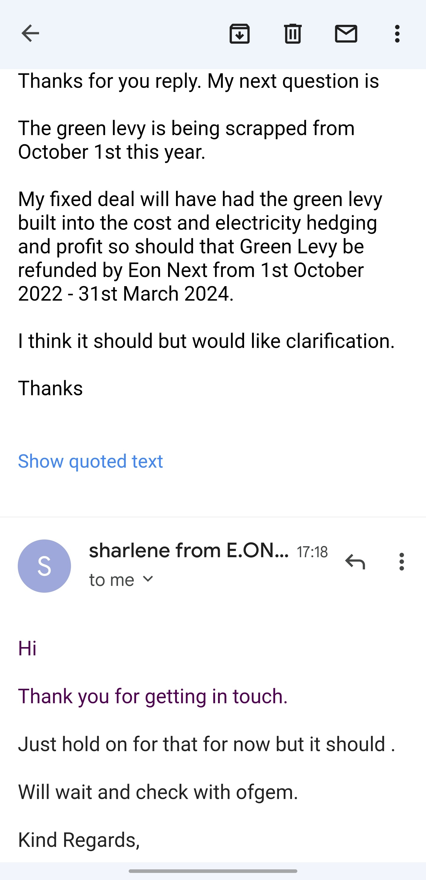I am not expecting a refund but I do expect they will check with Ofgem at the appropriate time as stated given the previous good responses and follow ups that have occurred once checks were made.0 -