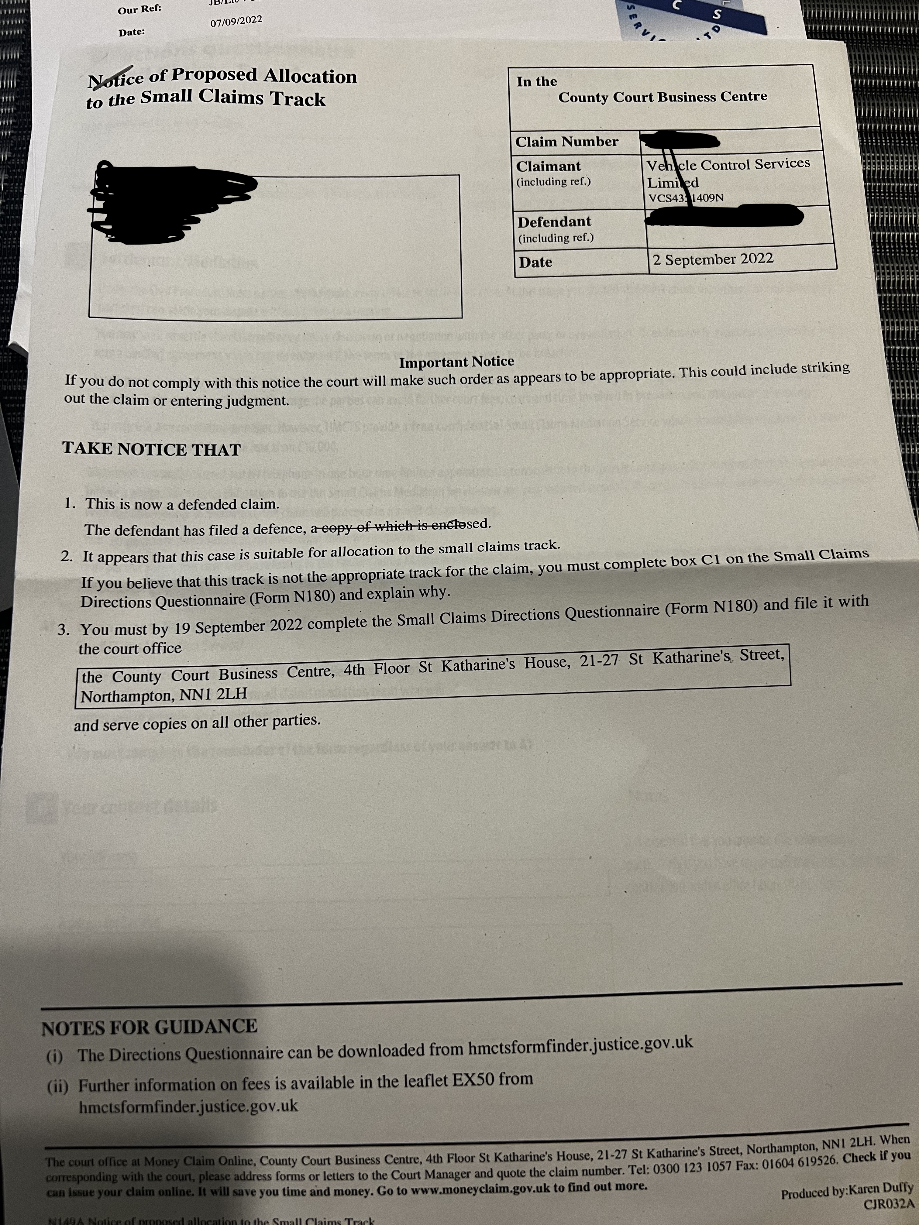 Notice Of Proposed Allocation to the Small Claims Track