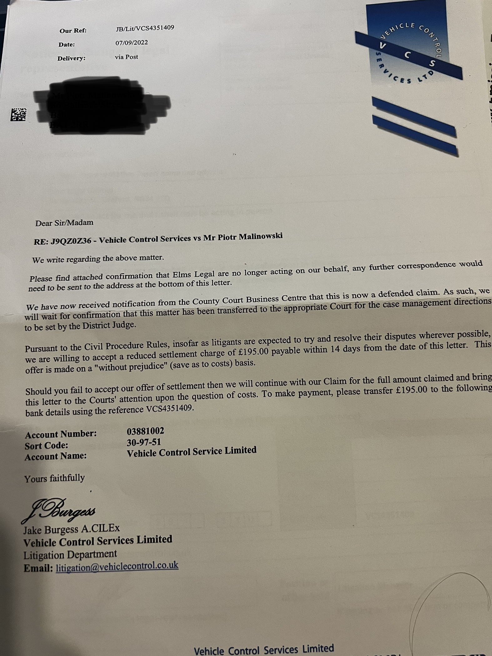 You haven't redacted you name (on the VCS letter) or claim numbers.1