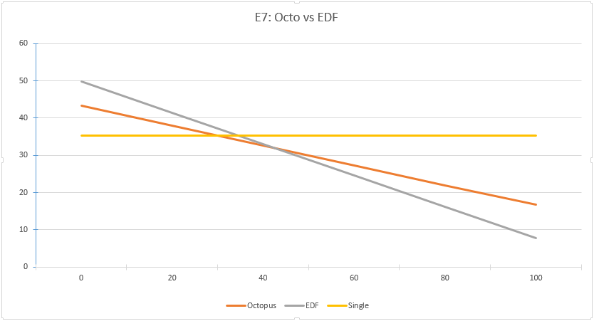 Octopus and EDF cross over around 42%, as expected.Octopus is more expensive than than single-rate until you get to around 30%.Despite falling faster, EDF's higher day rate means it only becomes cheaper than single-rate at around 35%.