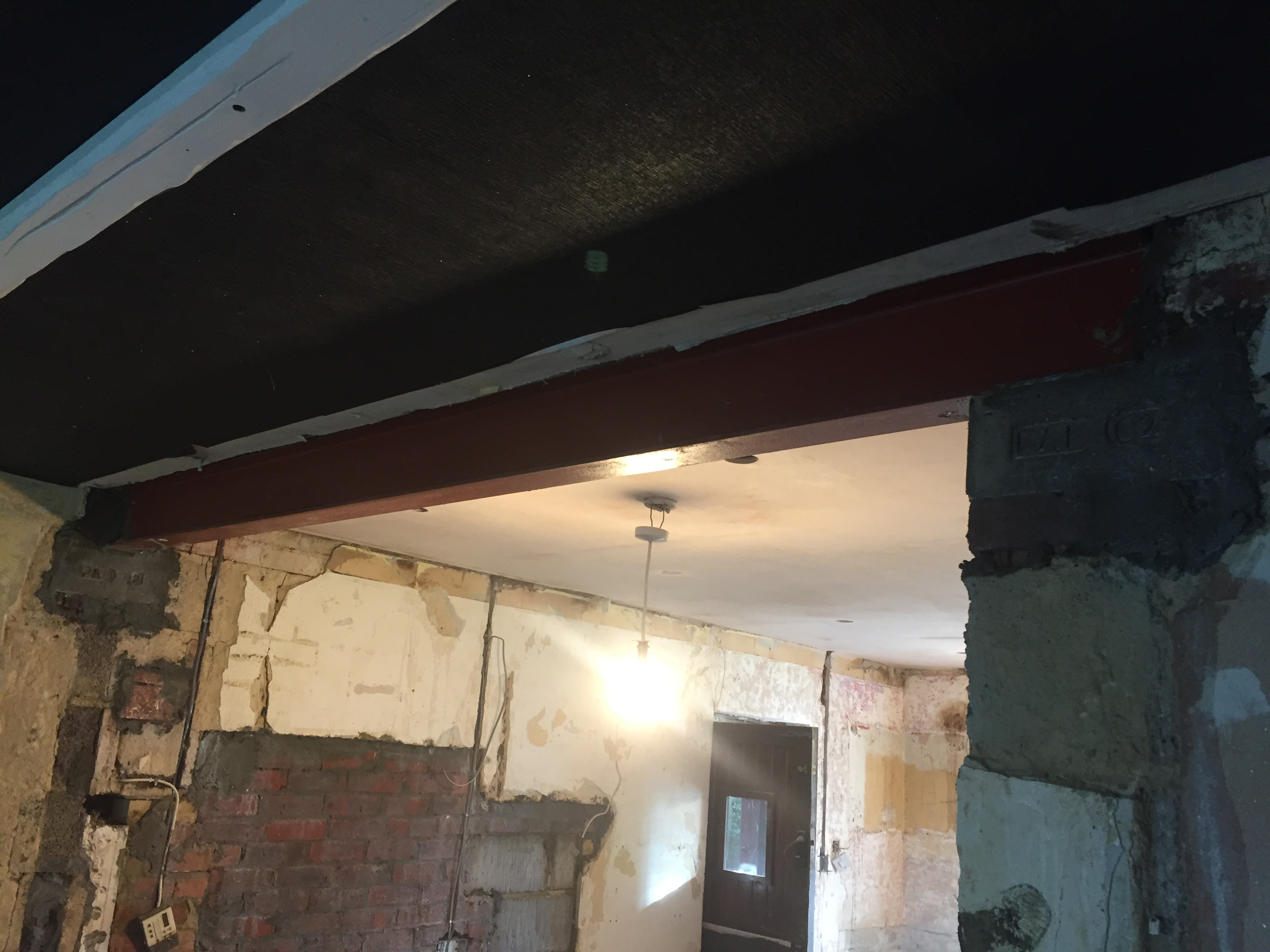 One thing to mention is a wall was removed (not a load bearing wall AFAIK) and a steel beam added to reinforce the area. This has been done in between the two areas I posted about originally and can be shown on the following two photos: