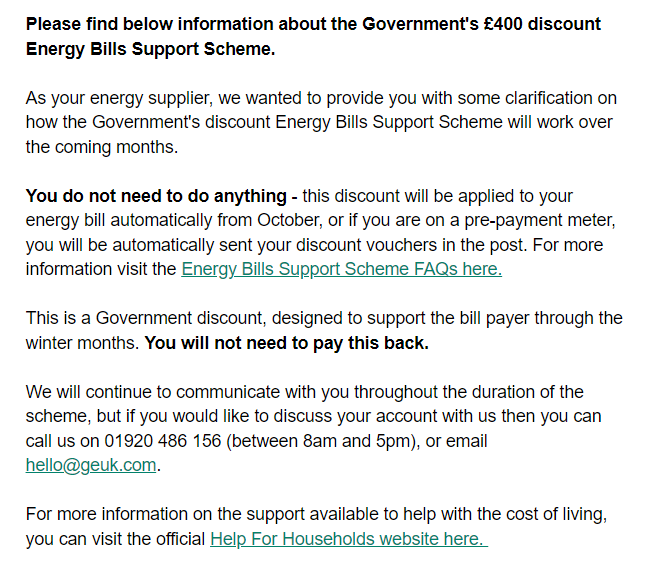 To date, I haven't seen anything to suggest that GEUK will be exempt from the governments Energy Price Guarantee, but since everything is still a bit up in the air we don't know for certain until GEUK confirm one way or another.