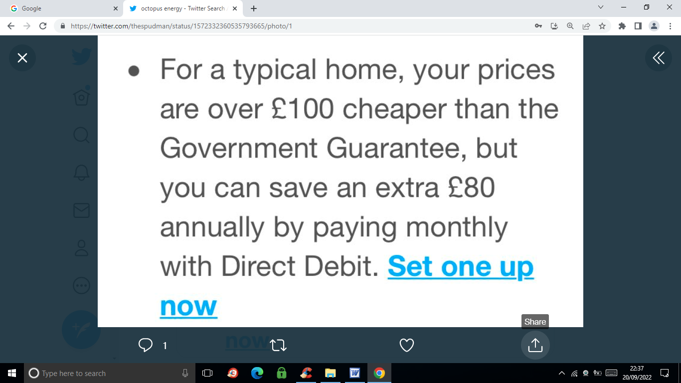 So will I get a reduction on the prices quoted in my email if I now pay by DD?The answer does seem to be 'yes', because Octopus have been forced to have a differential, albeit a lot smaller than it would be with say EDF for example...Assuming the typical 2900/12000 Electric/Gas use that is always quoted, your credit tariff is capped at £2,715, but Octopus only charge you £2,567, where EDF would charge £2,715.I don't have the DD rate for Octopus for your region, but the cap is £2,498, and the Octopus rate is likely to be a little below that, so the '£80' quoted is believable.