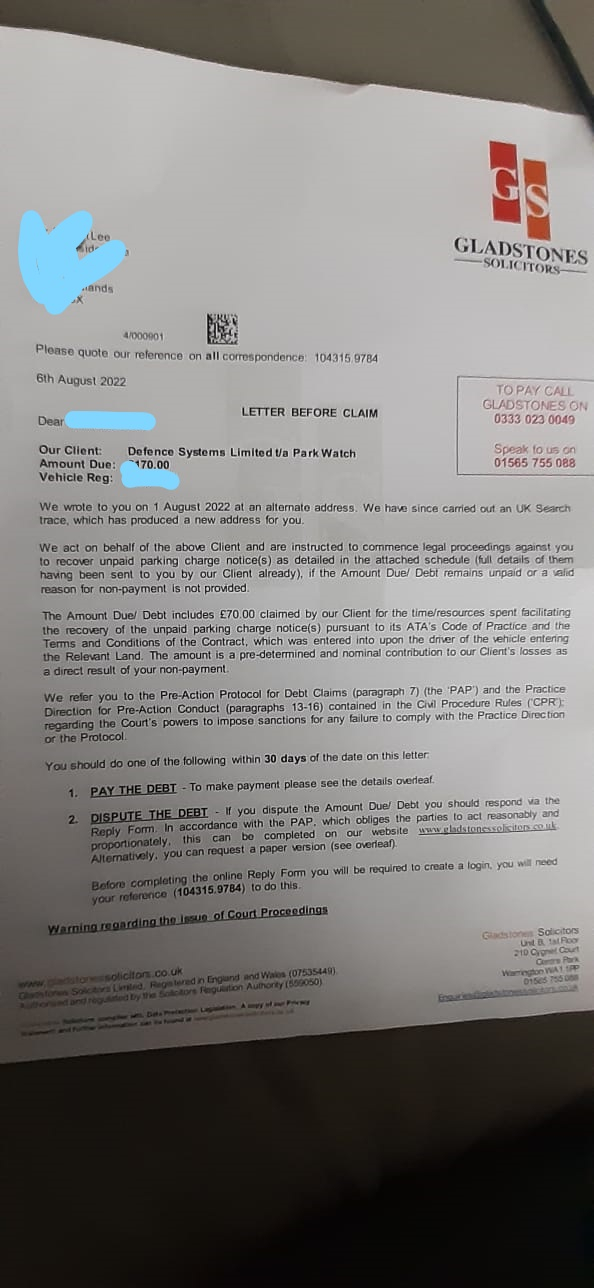 Hoping someone can help me please. I've received a letter before claim from Gladstones saying I owe £170 for a parking charge a couple of years ago. £100 for the original charge (increased from £60) then £70 added on by Gladstones.