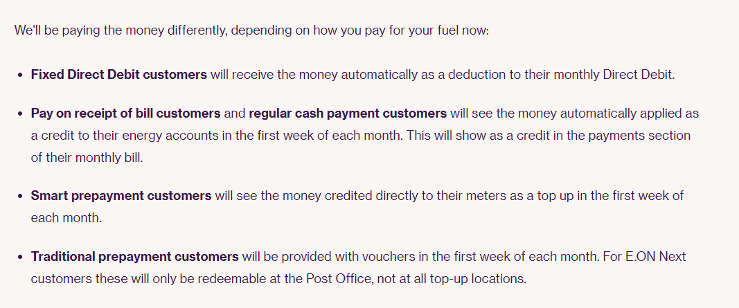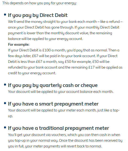 Can you reference somewhere where this method is outlined please, because that's not what I'm reading anywhere other than by posters on here. The Government web site states: "The discount will be applied to your monthly household electricity bill for 6 months starting in October 2022." I'm reading the same elsewhere too - a credit to your account, nothing about reducing DD amounts.molerat said:The company will not be "receiving" £400, they will be reducing your DD by £66/£67 per month for the 6 months or returning that amount into your bank account. You should not factor in the £400, doing so will possibly put your account into debit.