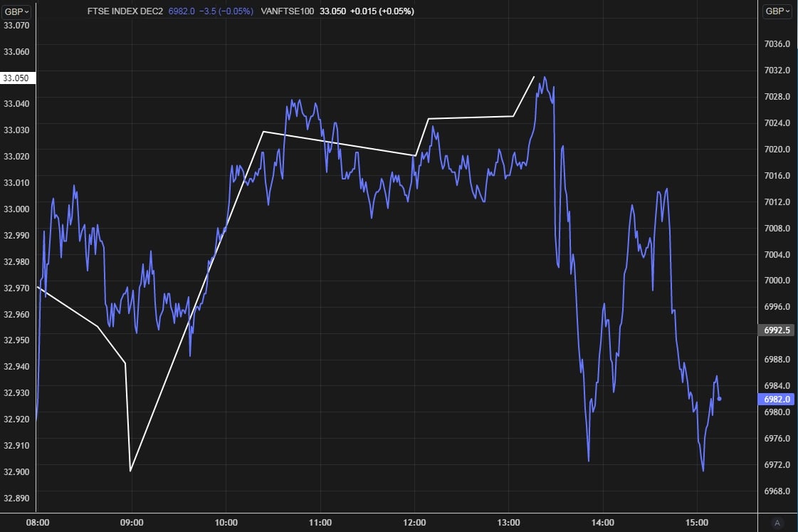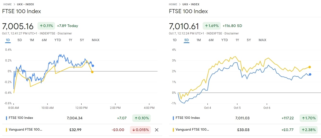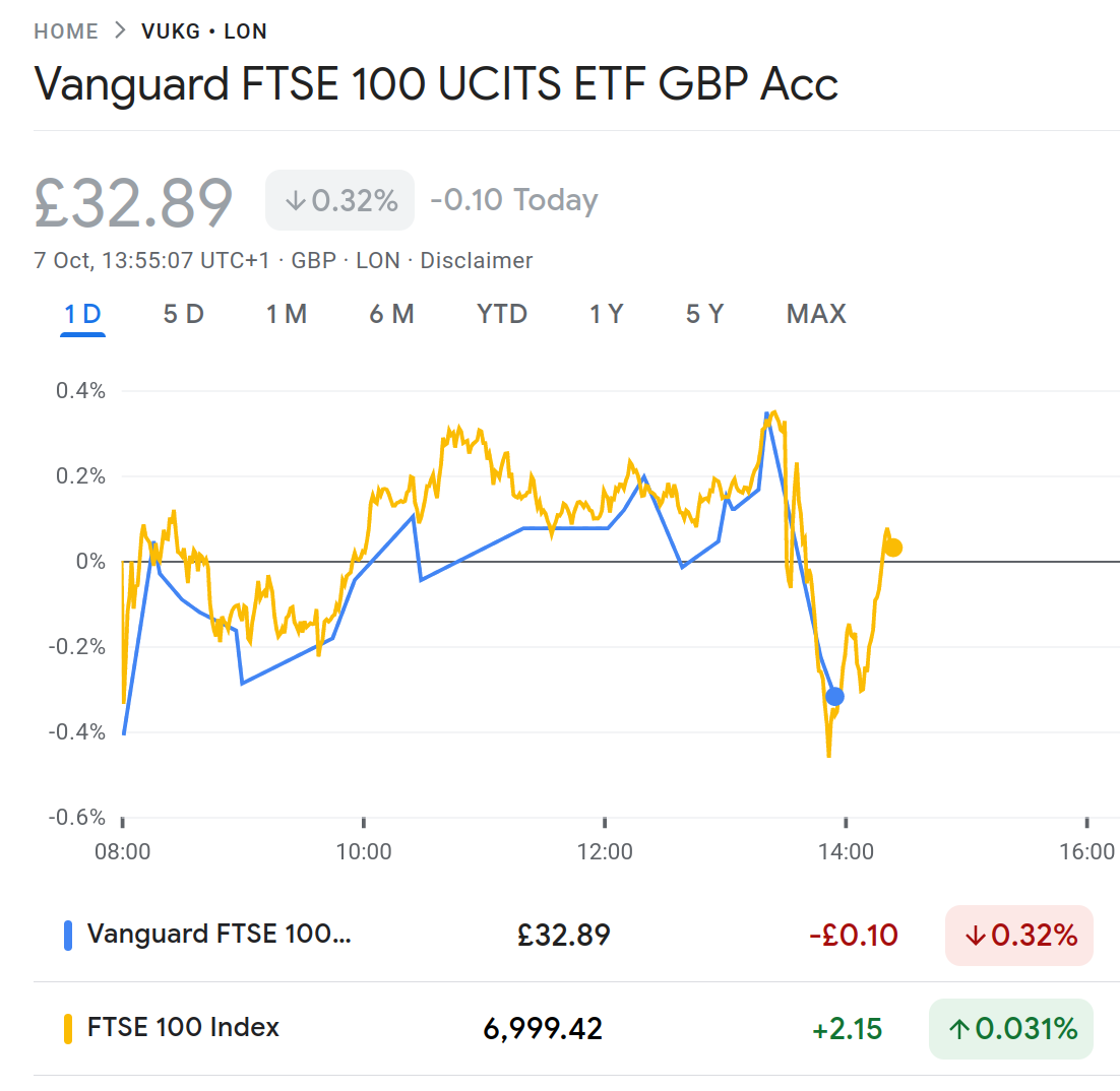 When I want to invest in the FTSE100, I use an EFT called 'Vanguard FTSE 100 UCITS ETF (VUKG)'. It's traded on the LSE in GBP. One aspect of ETF trackers I've noticed (over a few years) is that while they do eventually match the daily rise or fall in %, they don't do it immediately. There can be a delay of 1 hour give or take, between the underlying index moving and the ETF catching up. It's not delayed pricing either. I've logged in to my trading platform to get a live price on a deal and the ETF hasn't caught up.