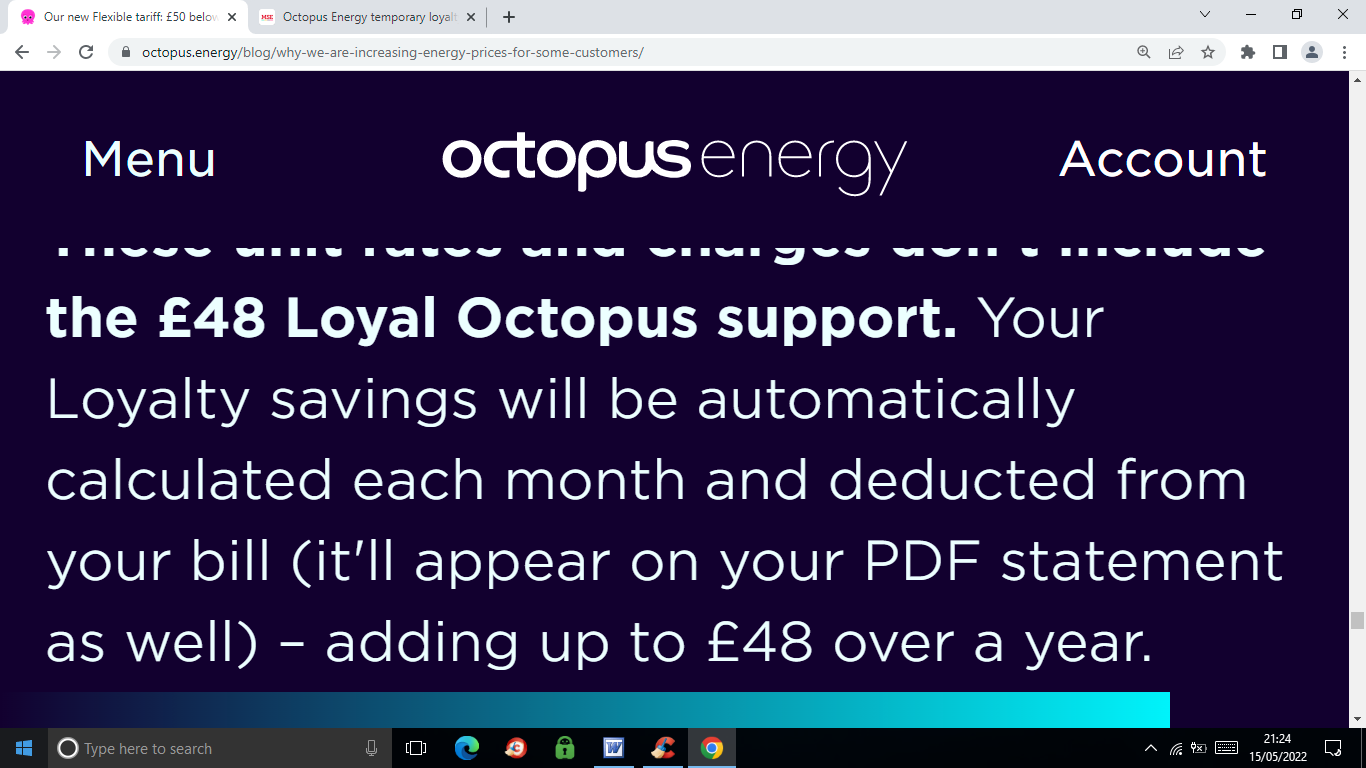 Take from E-mail from Octopus when notifying us about the 2 year Energy Price GuaranteeMouldyOldDough said:Octopus appear to have stopped offering a loyalty discount (13.15 p per day) on the standing chargeMaking my electricity now 27.1 p per unit +41.07 p per dayThis is a massive increase