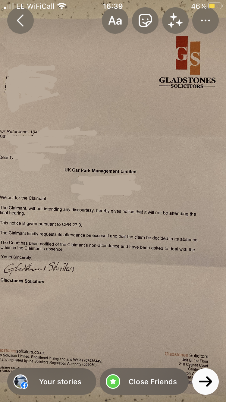 Please help. I am being taken to small claims court in a couple of weeks by Gladstone’s. I used the template defence found on this site and they are still pursuing me. I have just had correspondents that they will not be sending a representative (see attached). This was all for parking over a white line in an empty car park at 9pm! I would welcome any advice. Thank you I’m advance.