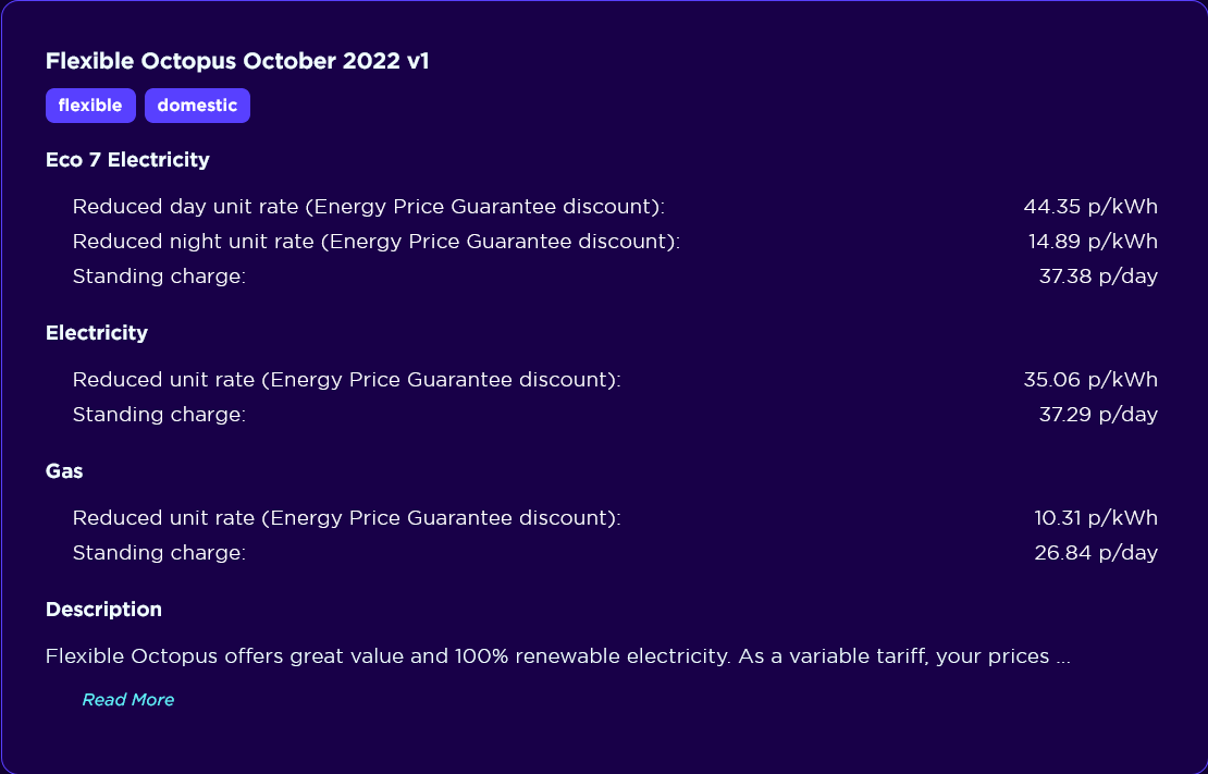 Put your post code in here: https://octopus.energy/tariffs/Do not use the 'quote' button, just enter the post code.This is the current variable tariff for Eastern region for example...