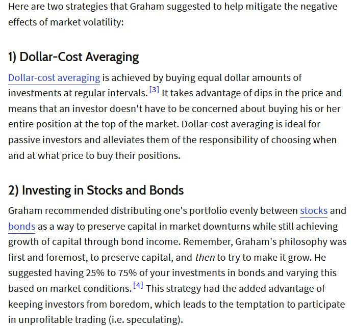 JohnWinder said:I think his advice was to hold between 25% and 75% as stocks, ‘“The sound reason for increasing the percentage in common stocks [beyond 50%] would be the appearance of ‘bargain price’ levels created in a protracted bear market. Conversely, sound procedure would call for reducing the common-stock component below 50% when in the judgment of the investor the market level has become dangerously high.”.https://www.investopedia.com/articles/basics/07/grahamprinciples.asp Benjamin Graham's Timeless Investment PrinciplesRemember, Graham's philosophy was first and foremost, to preserve capital, and then to try to make it grow. He suggested having 25% to 75% of your investments in bonds and varying this based on market conditions. With regard to market condition, keep in mind we are currently in the bear market.His other suggestion is to take advantage of DCA to take advantage of dips in the price. In the past if a person dare to beg a difference you would get a fierce attack by the same group of vocal people here on MSEs. Just learn the hard lessons from the guys who threw lump sum a few hundred thousands pound early this year while those who were telling people to do so have never done that themselves.