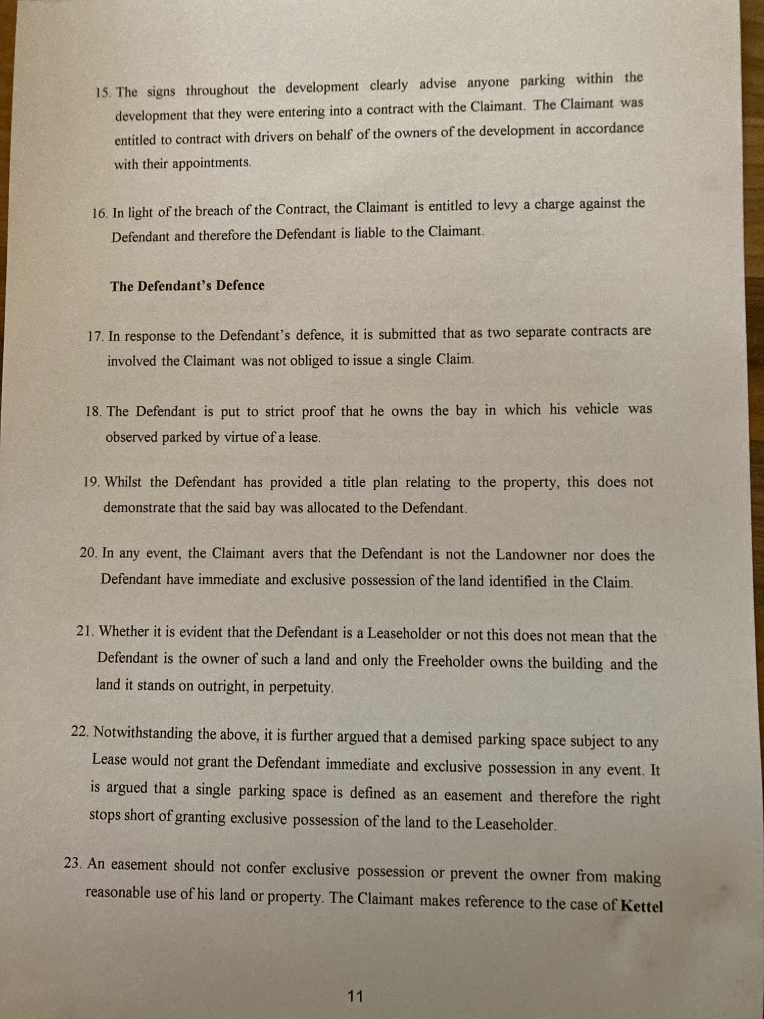 They are also arguing that, as leaseholder, my parking space is an easement and that I do not have exclusive possession of the parking space. They make reference to Kettel v Bloomfield 2012.