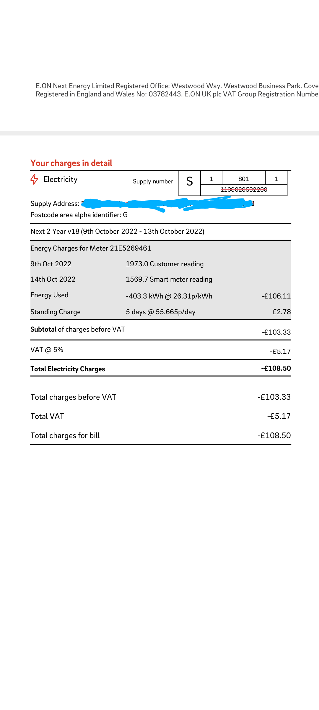 I fear that your continued submission of the total index reading has raised an alarm within ‘Kraken’ - E.on Next’s billing system. I suggest you call them and ask CS to confirm that they can read your meters remotely? Get them to confirm that you are on a single rate tariff?eastcorkram said: