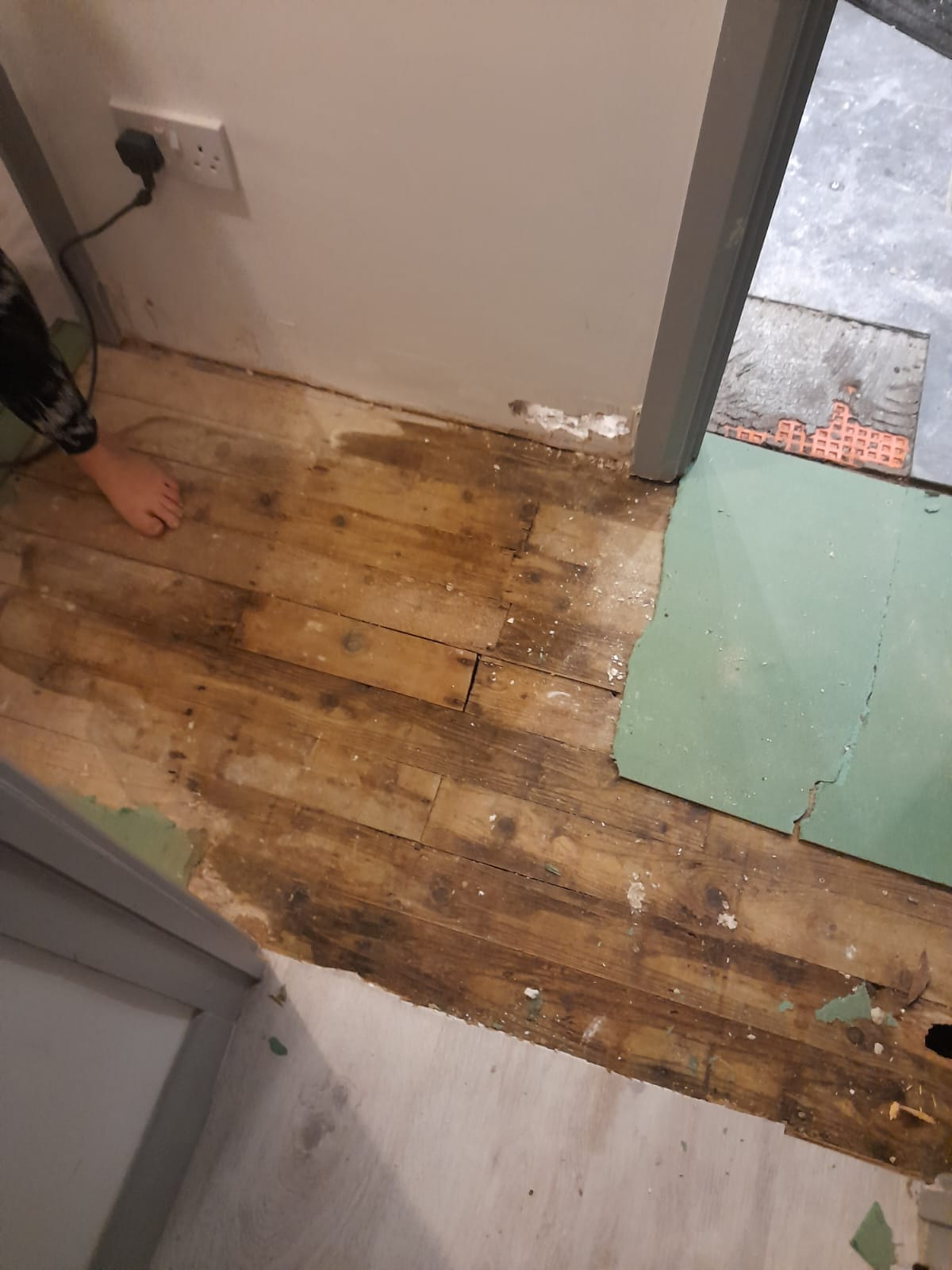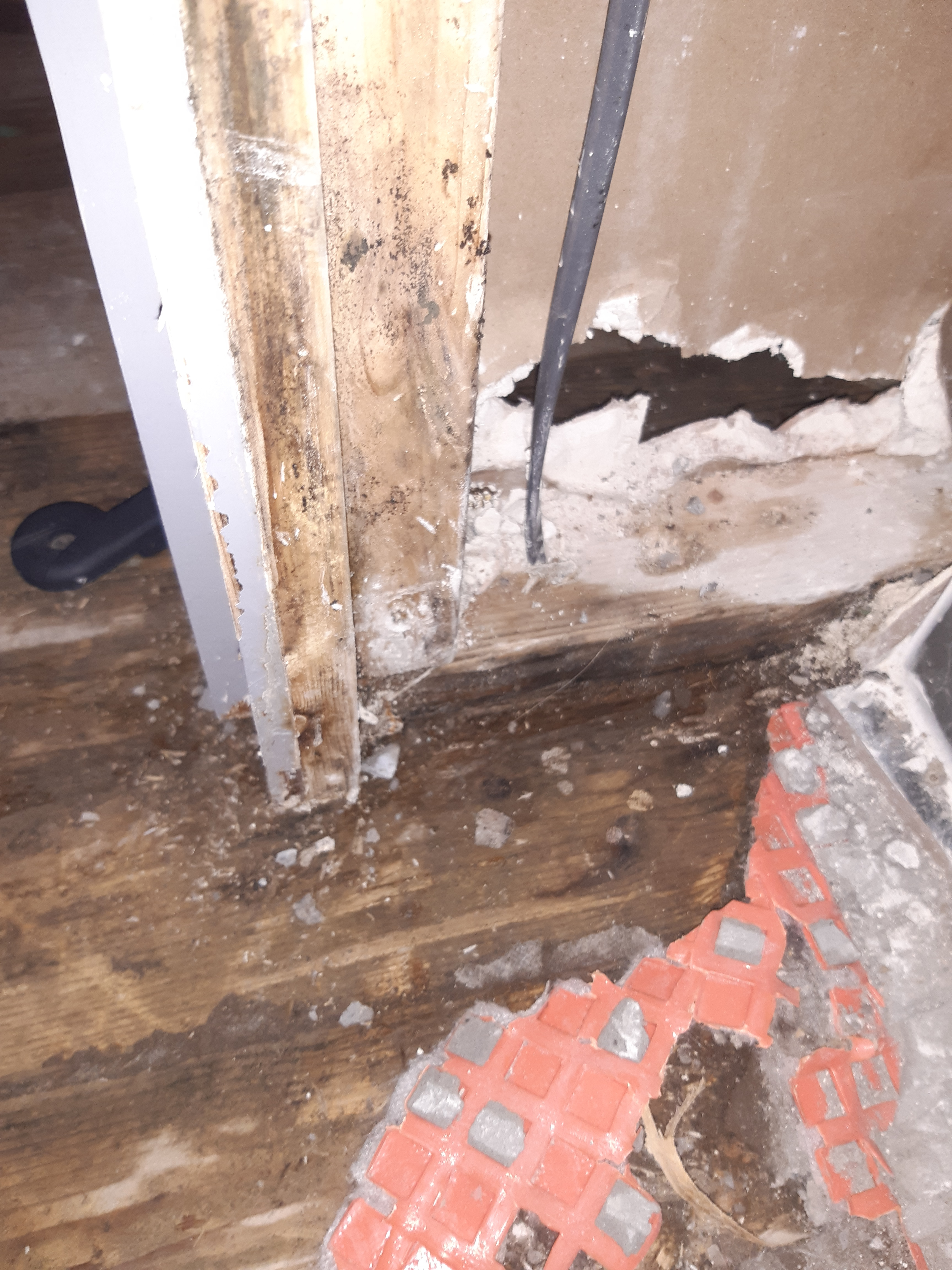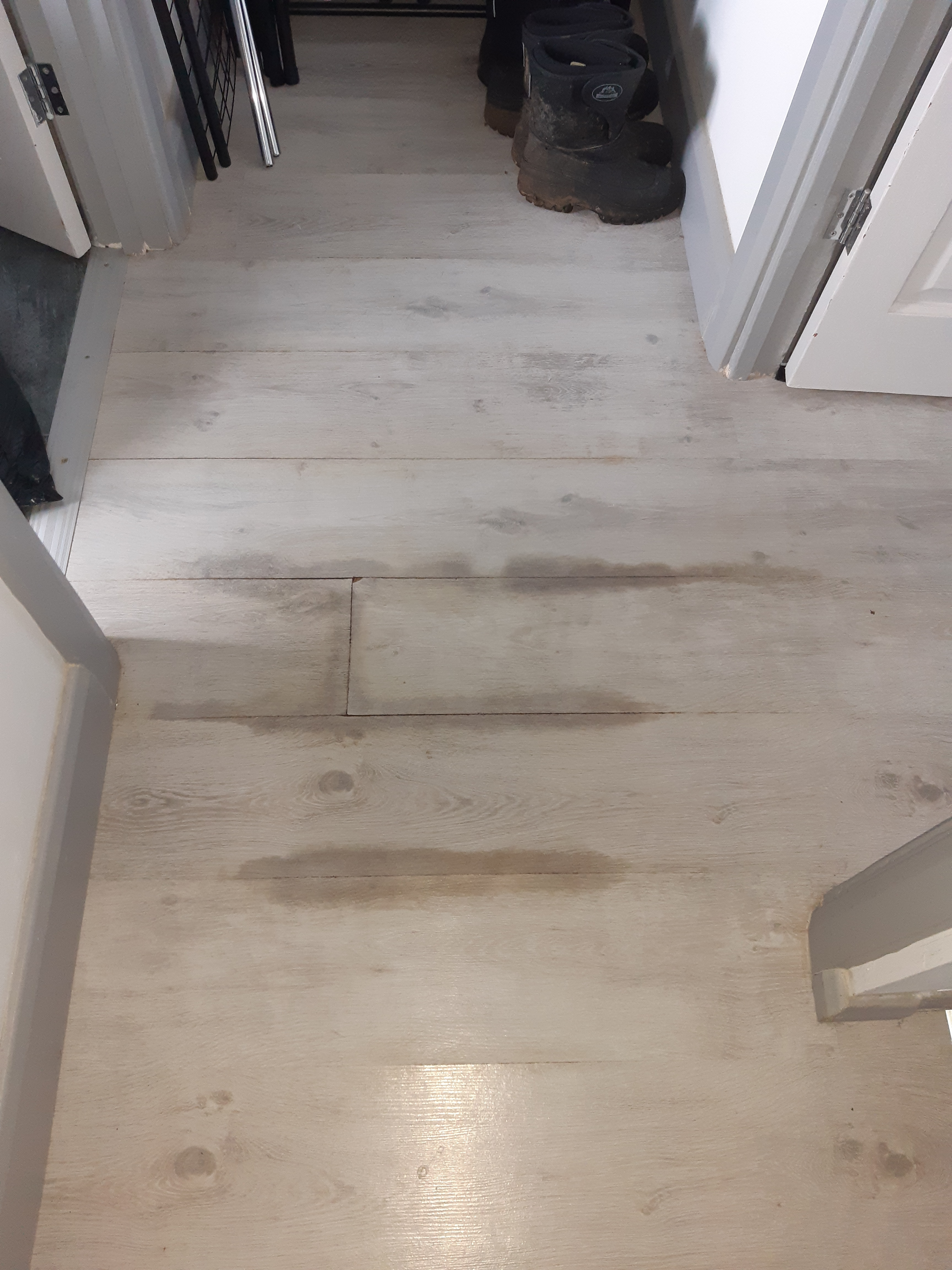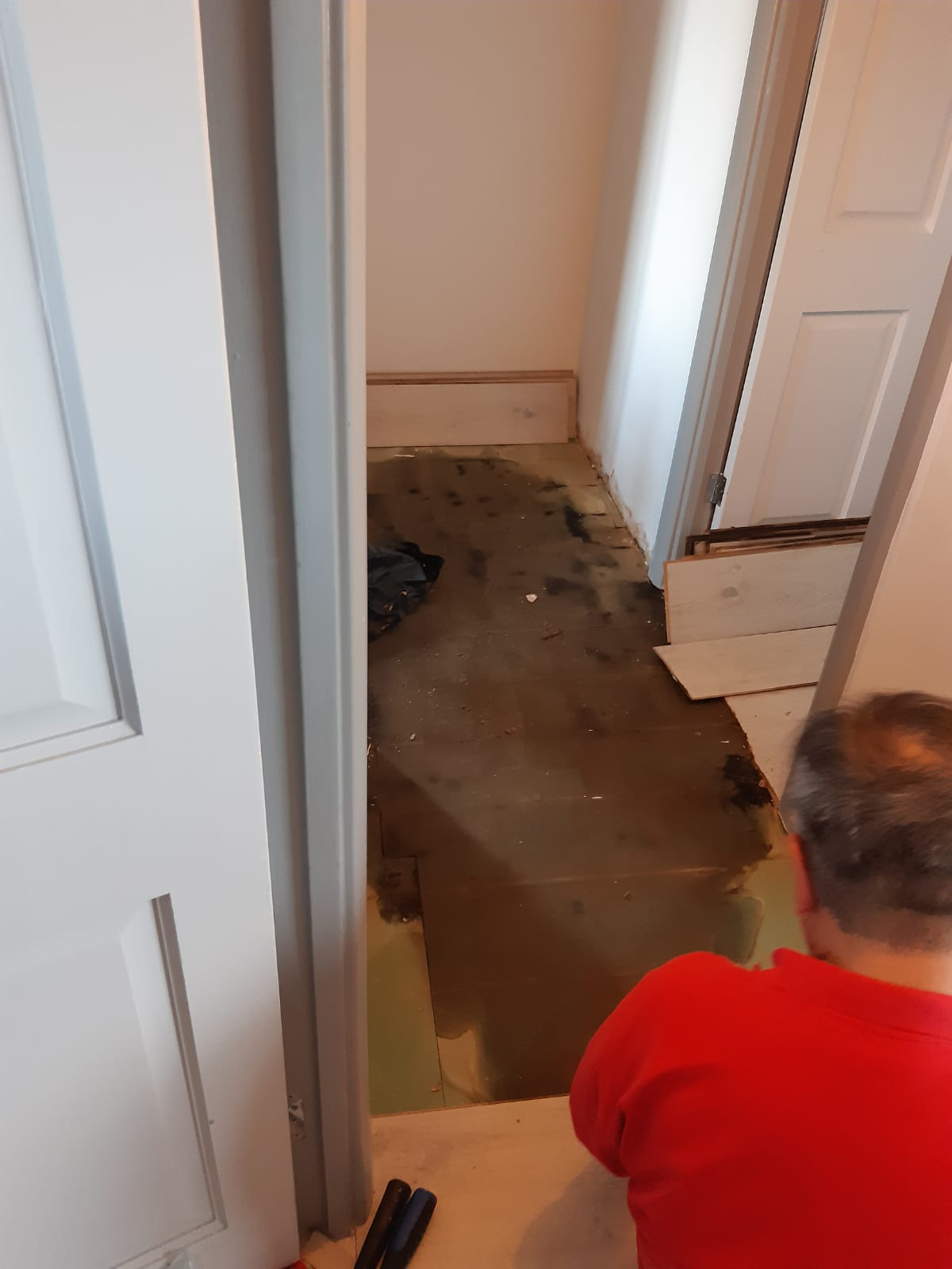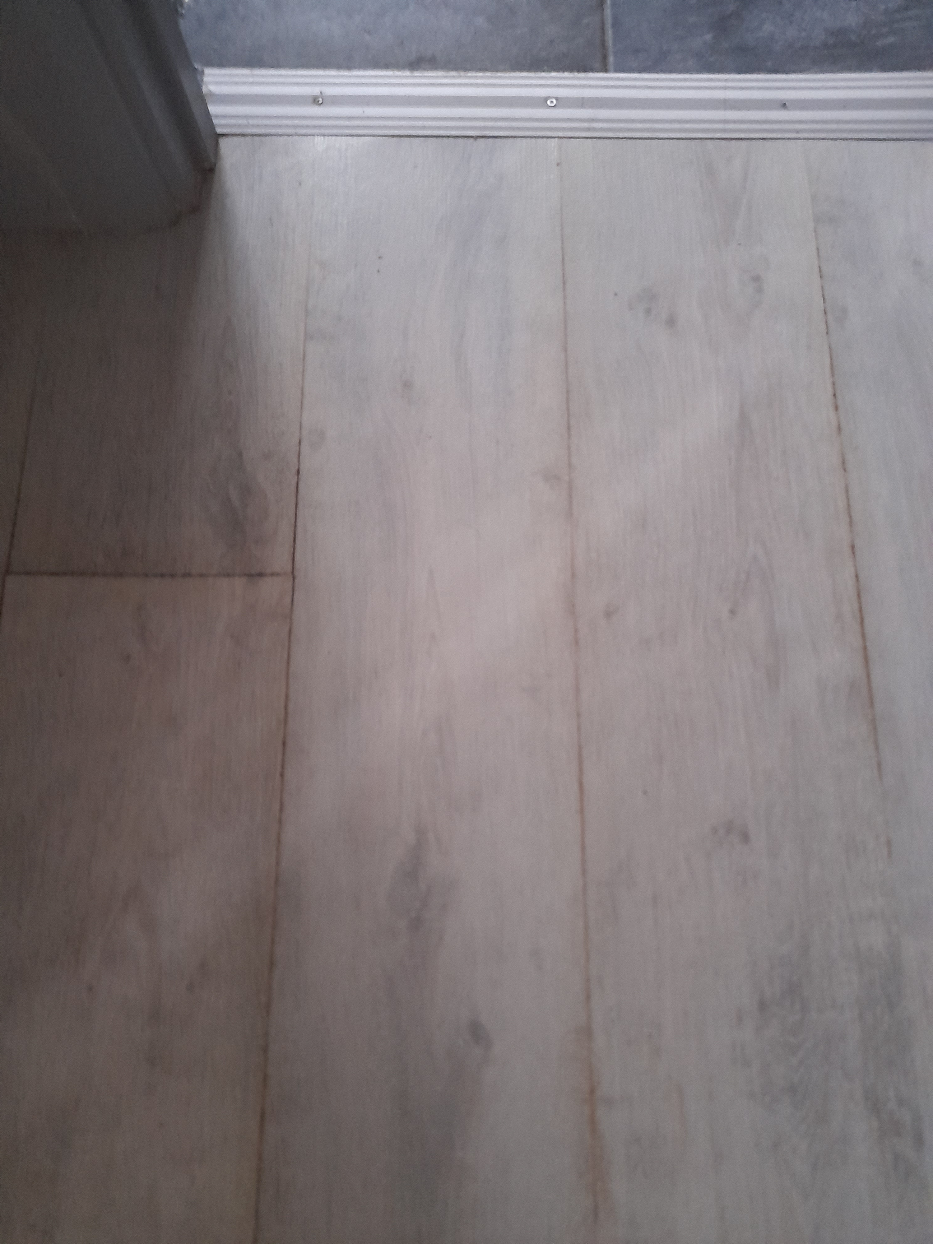 This then carried on for a number of weeks with multiple visits by her and an elderly gentleman, no idea who this guy is as she has never introduced him. Neither of them speak particularly good English which makes trying to discuss with them really difficult. She seemed to fail to grasp that a water leak will not resolve itself and that if left ongoing would likely end up with water damage to her property, something we were imploring for her to avoid for both parties' sake. I worked in construction briefly when I left school so I had some knowledge of what I was saying. I had advised that the laminate flooring be taken up to ascertain the state of the floorboards as by August / September water was appearing between the laminate boards and the bathroom door frame had started to warp and show significant signs of moisture damage.
