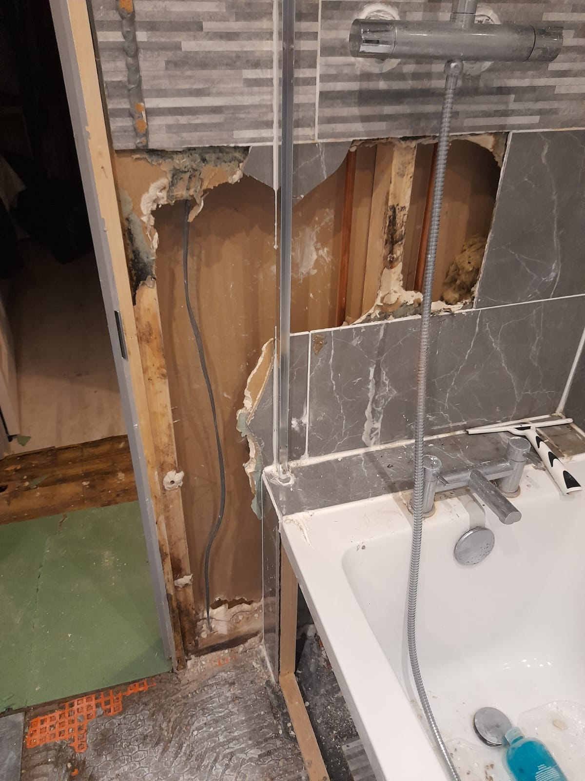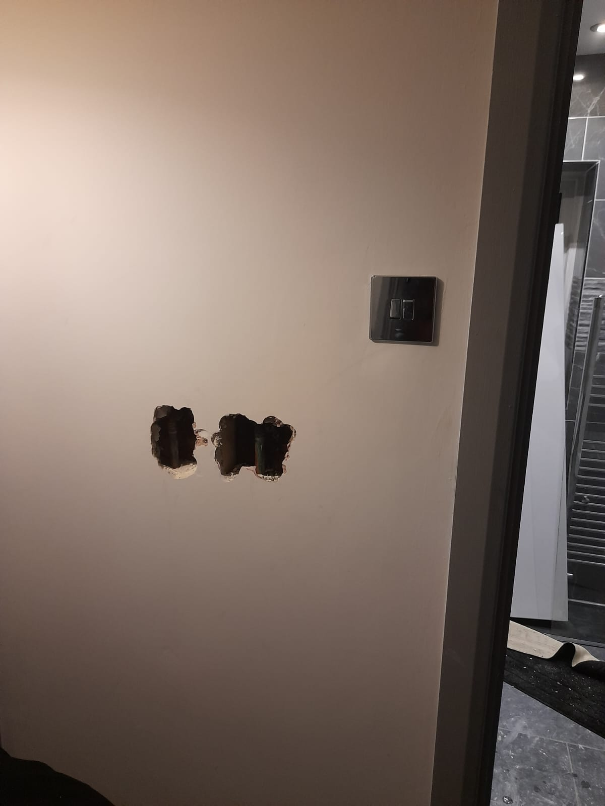 We got a message a couple of days later stating, not asking but stating she and her contractor were coming to look that Sunday evening. I said no problem however with it being a Sunday it was to be just a quick visual inspection then arrange for someone competent to come and undertake the work at a more reasonable time. They turned up an hour and a half early, unannounced, went upstairs and proceeded to rip up some more flooring. Then proceeded to smash holes in the plasterboard walls, both hallway and bathroom along with tiles that surround the back of the bath / shower. They were here for just short of 3 hours during which time at one point there were 4 of them standing around the bathroom doorway. Again, claiming there is no leak and that she would go away and “have a think”.