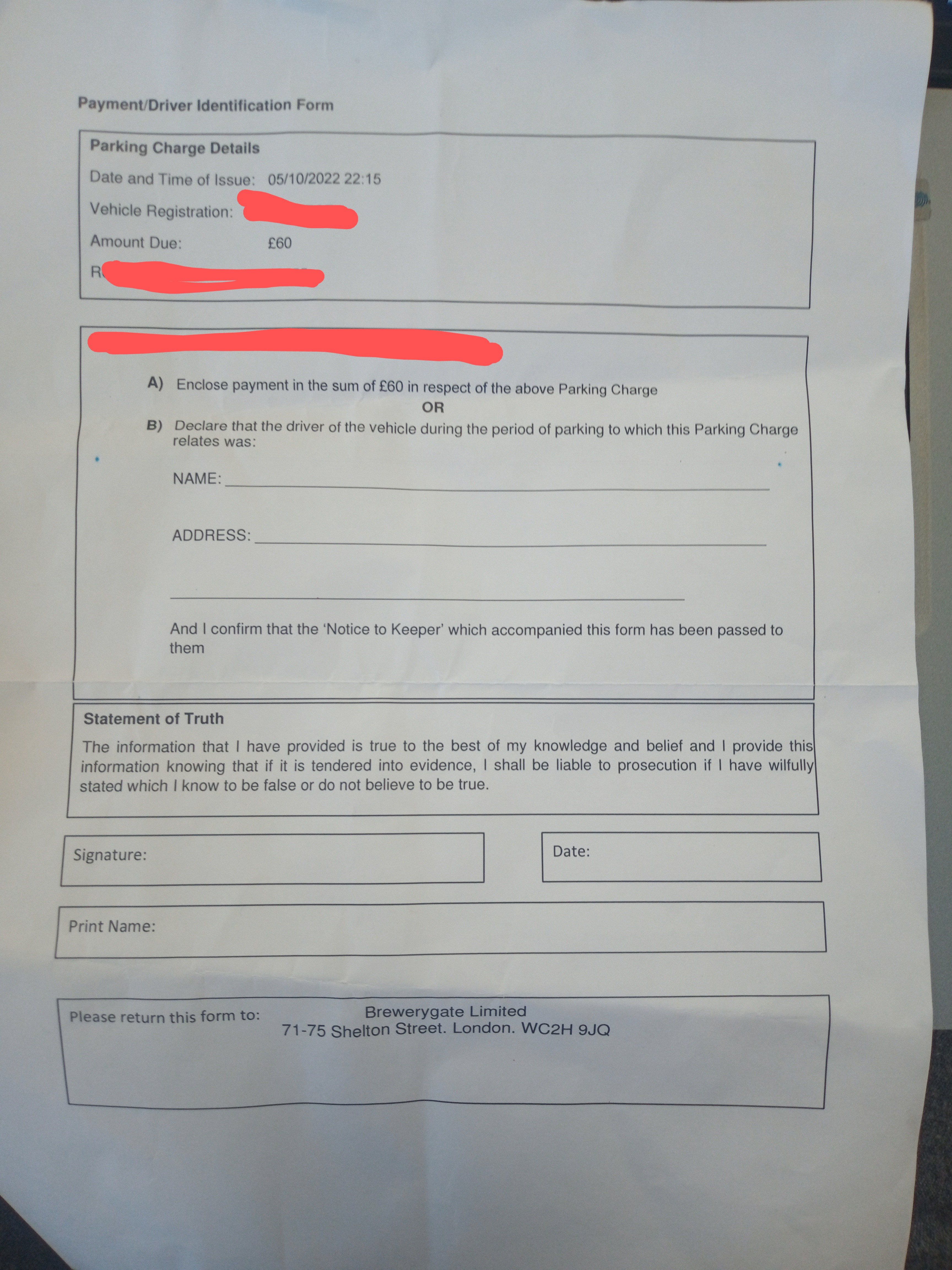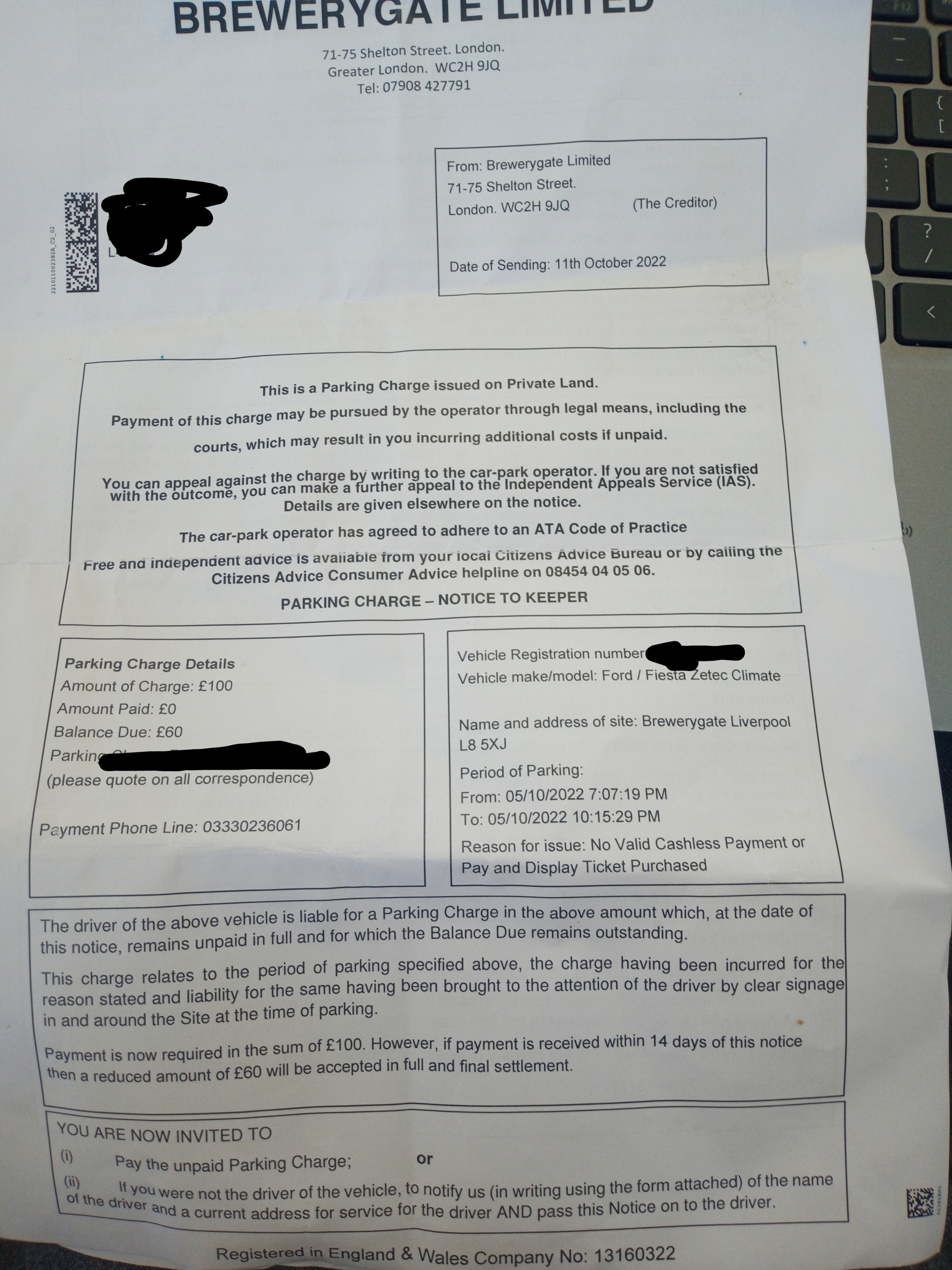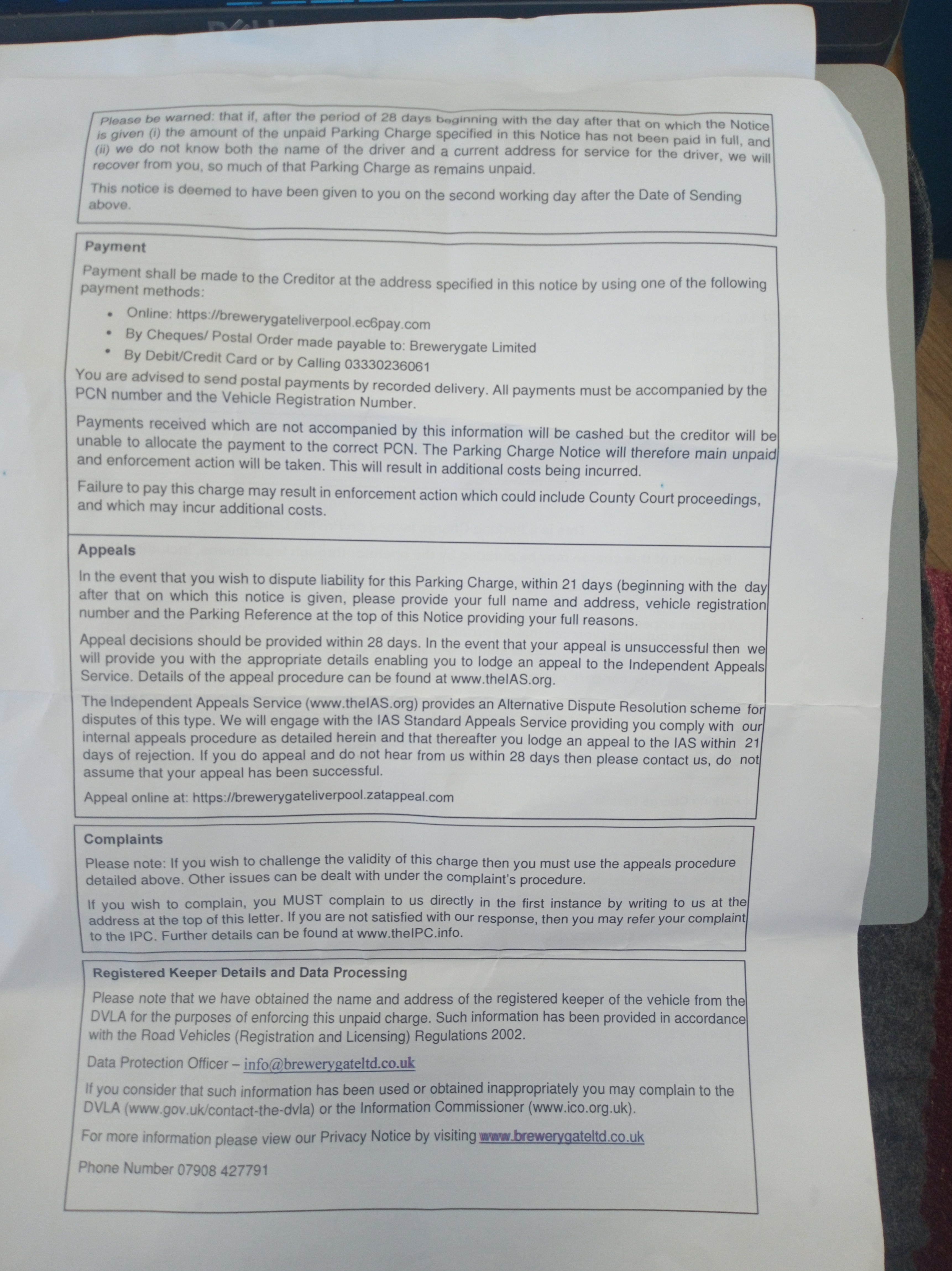 How do I know the parking firm? All I've got is a letter from Brewerygate limited. Nowhere throughout the letter is there another name ie for parking firm. It says the site is Brewerygate and it's also 'from' Brewerygate. If I want to appeal its also on Brewerygates website, and same as if I want to email.Coupon-mad said:No, which parking firm?