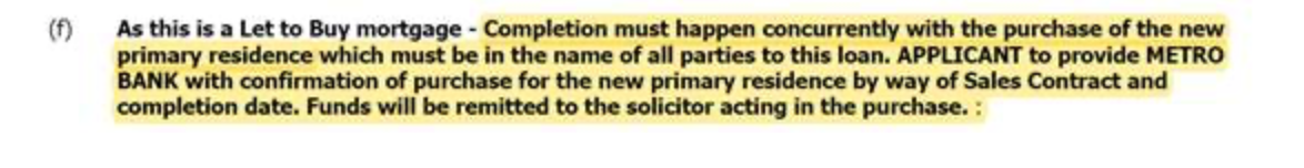 I have pasted the condition that is in our mortgage offer above which states that the completion must happen at the same time as the residential. As I said, this won't work because the remortgage funds will fund the deposit on the purchase, which won’t be ready to complete for around a month. Current owners have stated there is no way they can move out before the end of November. The deposit needed will have to be sent to the developer at the top of the chain on exchange as standard with a new build that our sellers are buying, and we obviously can’t exchange without re-mo completing.This seems very unfair as once we complete on our house it turns into a BTL so we shouldn't be living here. We can't complete on our onwards purchase because the vendor won't move out and the developer for the new build has already given us 3 extensions but said this coming Monday was the last one before he pulls out of the deal.