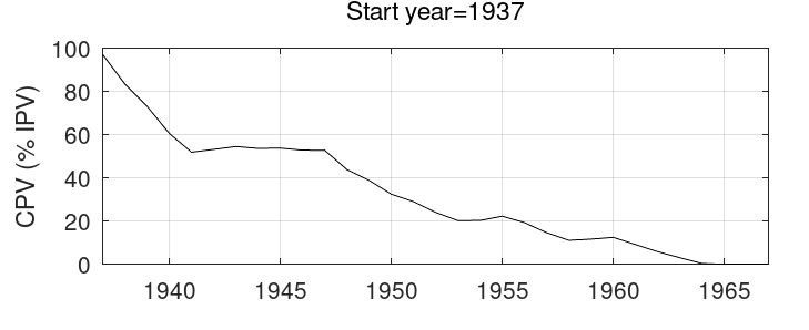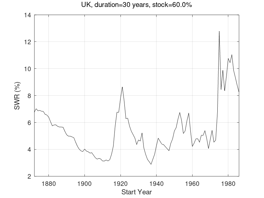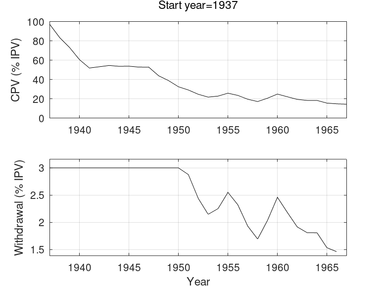 Even with 1937, a slight course change after 15 years (i.e. when the portfolio dropped to 20% of the original value) reducing the withdrawal rate to 2.7% would have just ensured portfolio survival for the 30 years. It also happens that using a different inflation model to the one I've used (the database at https://www.macrohistory.net), and there are at least 4 versions of UK inflation before 1948 (when RPI was officially introduced), allows 1937 to survive at 3%.bostonerimus said: