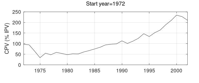 Look at it this way, someone retiring in 1975 would have had an SWR of 7 or 8% as this is the same as 3% of what the 1972 pot had fallen to in 1975. If you assume the 3% )of the 72 pot) was safe to continue with in 1975 based on history then you are also saying the 7.5% (of the 1975 pot) is safe (for a 27 year retirement) as mathematically they are equivalent.I think....2 -