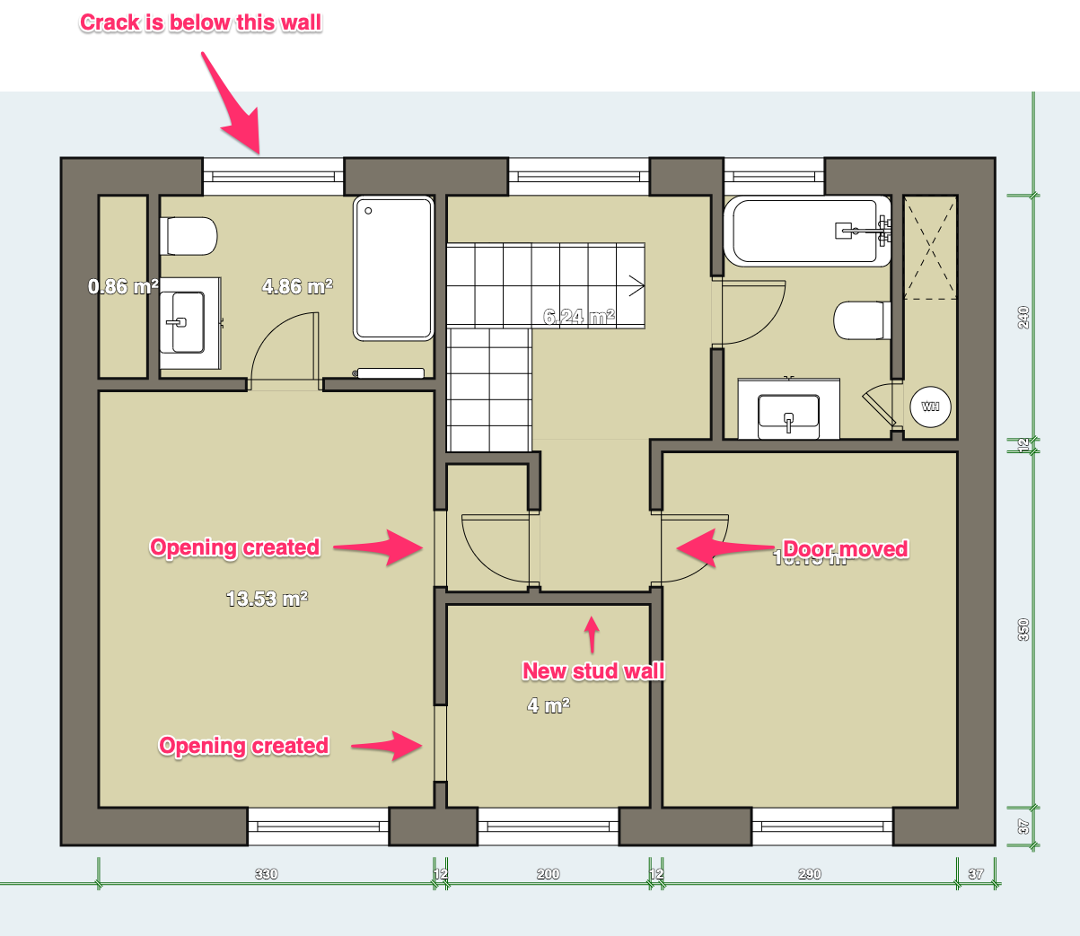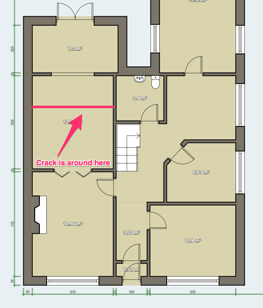 We found the structural timbers when we did the work (we had to change our plans for that reason) but the only edits made to the original walls where cutting two openings in them, which are well away from this issue.Are you sure that is the position of the (rear?) external wall? If it is, then the right hand end/corner would appear to be above a window - which for structural/aesthetic resaons is usually avoided.Being stud construction doesn't mean it isn't loadbearing - as per the two internal walls on the first floor. Somehow the roof load has to be carried down to the foundations and this (as was the case in your previous thread) would cause me some concern as the layout lacks some of the features which are the norms of dealing with loads in traditional methods of domestic building.I wouldn't necessarily suggest your alterations are the cause of the crack (especially as it has been there from the start) but it is possible there are structural elements above the kitchen ceiling which have (or are) moving from loads above. This is why the "advice" from aoleks is wrong - the logic he uses incorrectly excludes the possibilty of a pre-existing structural issue.If you are sure the external wall is above the kitchen then you need to get a structural engineer to inspect and advise.0 -