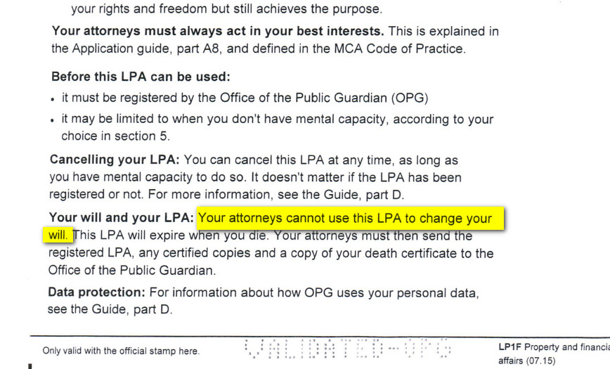 Eek! That’s worried me now reading the next bit about sending back LPA and certified copies on death. I had no idea about that and so didn’t. I didn’t see it written anywhere when I was dealing with the estate.BooJewels said:I don't think an LPA can be used to change a will - I've just been looking at one as I'm just using it for something and it specifically says "Your Attorneys cannot use this LPA to change your will" - on both the Finance and Health ones.