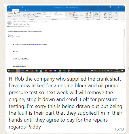 robrymond said:So it turns out one of the parts they used has failed:Now found the issue it was the new crank that snapped. It's not our fault but the crank shaft manufacture which should not have broken. Obviously the supplier at most will only replace the crank but the recovery all the labour I'll have to swallow. Fortunately it has not damaged any other part of the engine, but will need a new crank, big end shells and conrod shells to be on the safe side. But I'm pleased to say you will not be expected to pay for anything as this should not have happened. I'll be contacting to supplier now. I'll keep you up to date with progress.