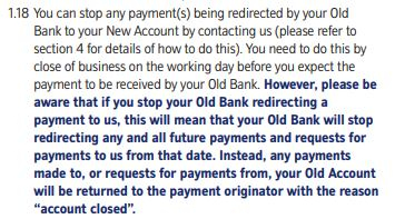 Just for info: It is possible to stop redirection by contacting the new bank. They will contact the old bank who will arrange to start returning payments with the reason "account closed". I have tried and tested this and it works.