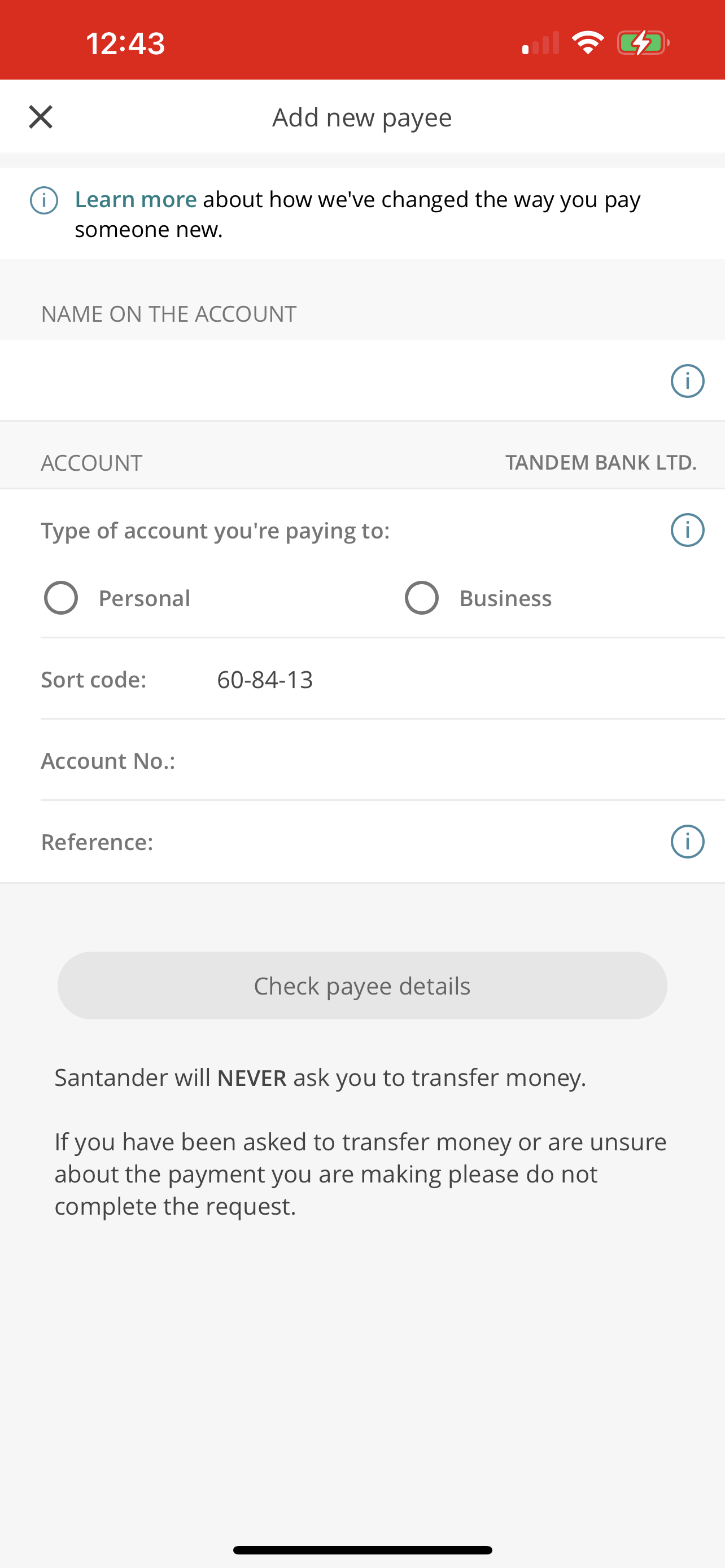 Santander’s systems do recognise the Tandem sort code when you set up a payee. They just can’t check the account number account holder name as Tandem don’t participate in COP yet.